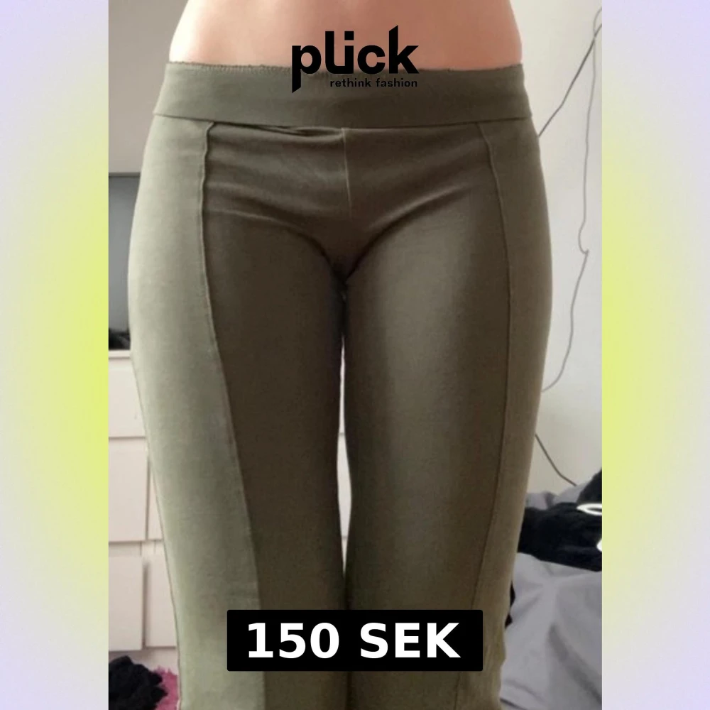 Säljer ett par olivgröna byxor med hög midja och croppad längd. Byxorna har slits vid benslut och är gjorda i mjukt bomullsmaterial. Snygga sömmar längs benen ger en cool look. Perfekta för chill dagar eller när du vill vara bekväm eller för vardaglig användning. Kan vikas ner utan att det ser konstigt ut 💋