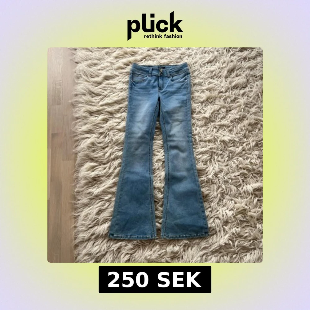Säljer ett par helt nya ljusblå bootcut jeans stl 164 från RYVLS Stockholm med låg midja. Jeansen har klassisk femficksdesign med ficklock, dubbla knappar i midjan.