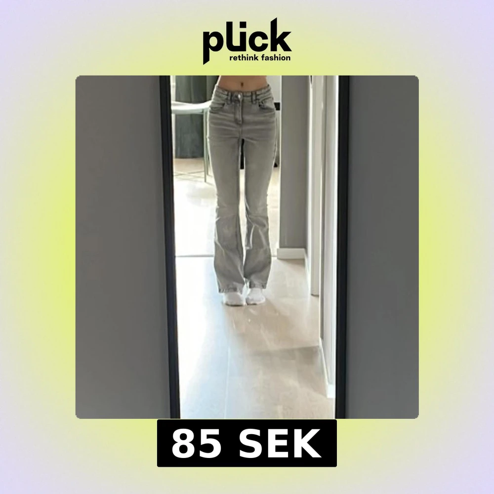 Säljer ett par knappt använda gråa bootcut jeans från Denim Day i storlek 164. klassisk femficksdesign och är tillverkade i mjukt denimtyg. Snygg passform med lätt utsvängda ben och silverfärgad knapp framtill.
