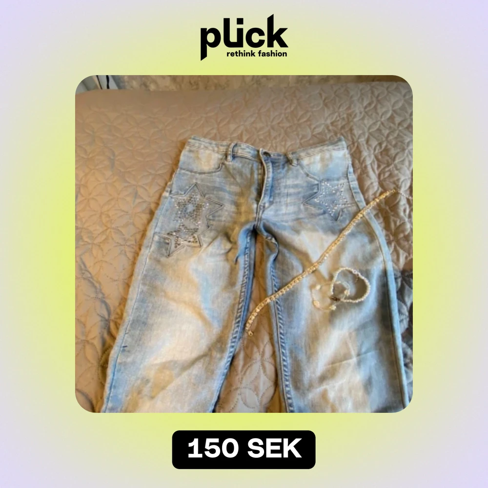 Säljer dessa jeans som jag själv sytt om till bootcut, dem har små gulliga stjärnor på benen och 1 på bakfickan, säljs så det är för små för mig (skriv privat för bilder på) mått vet jag ej. Strl 164
