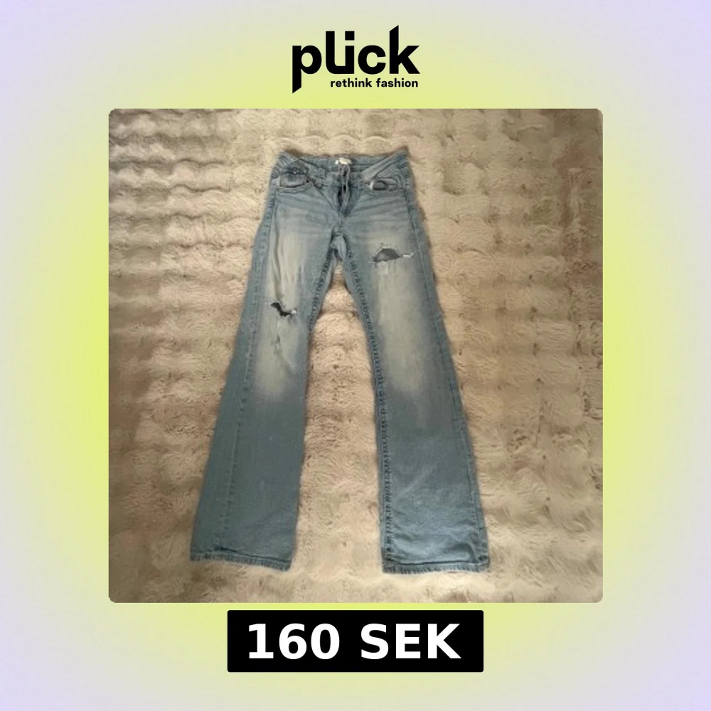Säljer ett par ljusblå jeans som är bootcut och low waist. Dom är lite för stora på mig som är 166 men också storlek 164. 2 hål där fram. Bra skick men använder inte!