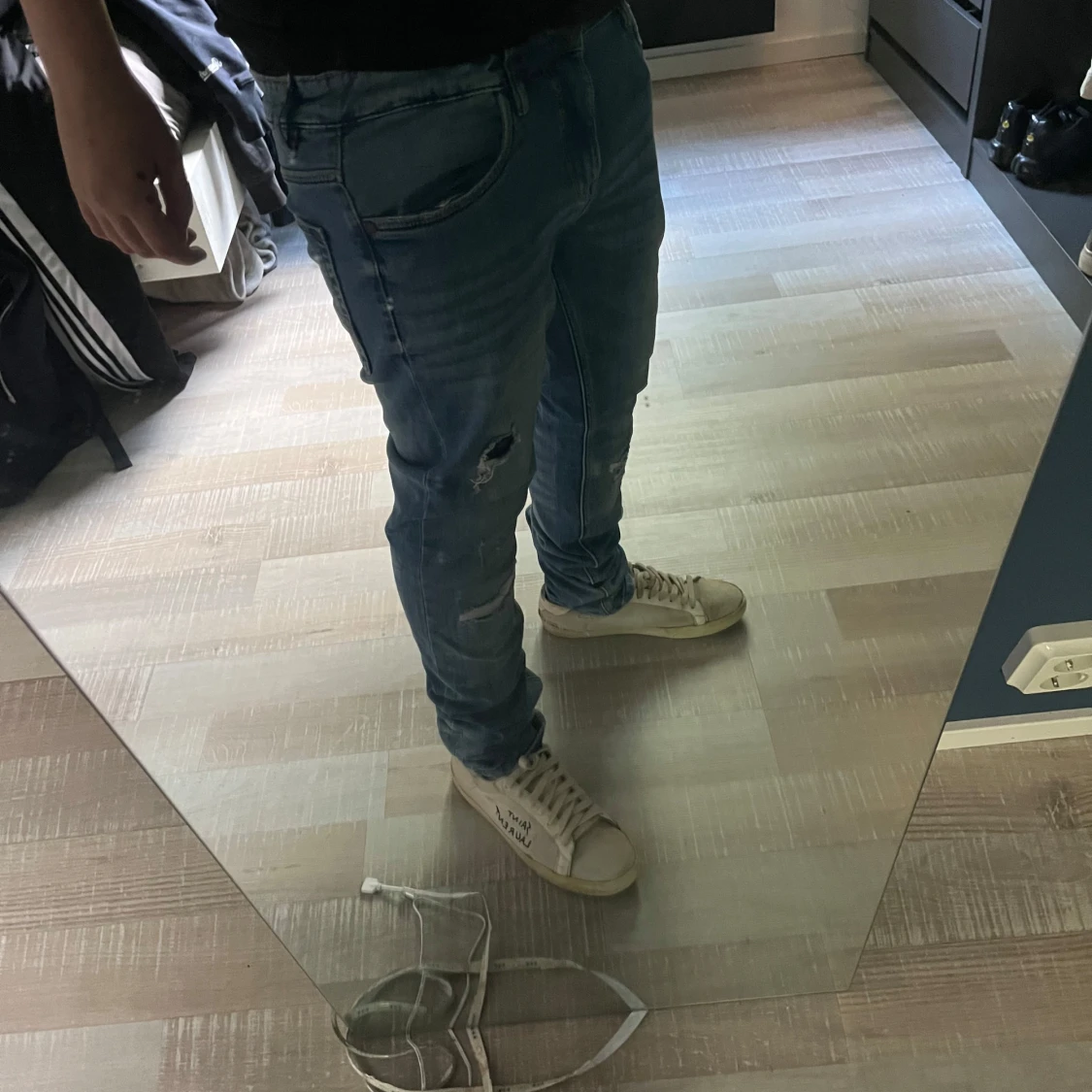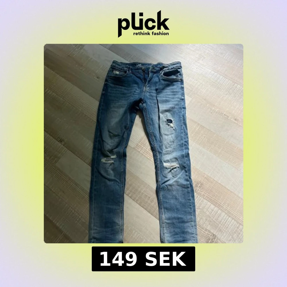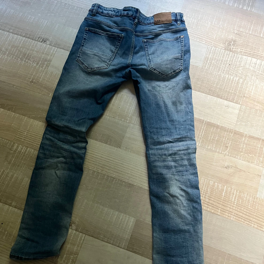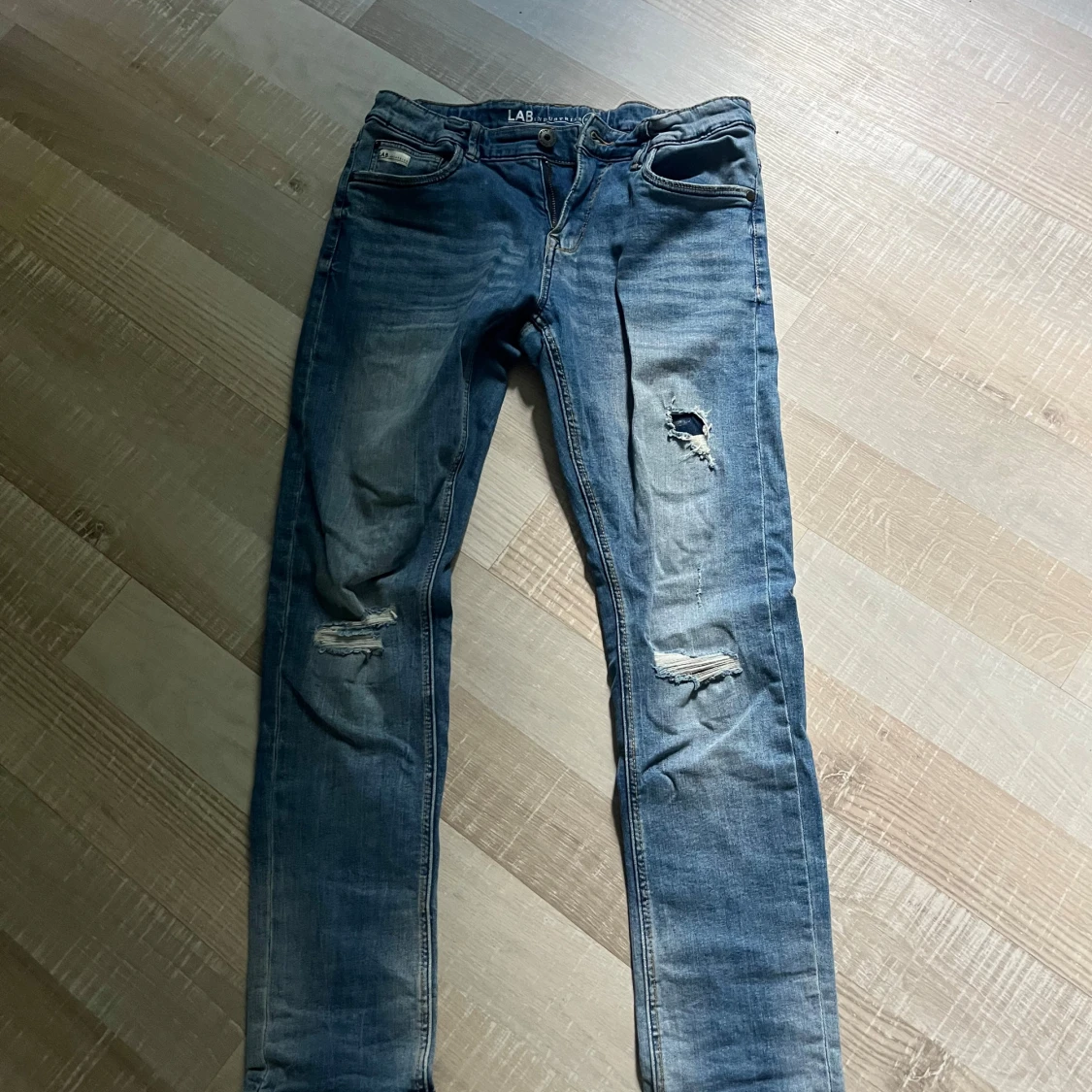 Säljer ett par blå slim jeans från LAB med slitningar och hål på knäna. Jeansen har klassisk femficksdesign, normal midja och är tillverkade i stretchig bomull för en tajt passform. Perfekta för en avslappnad och trendig look. Är i stolek 164!