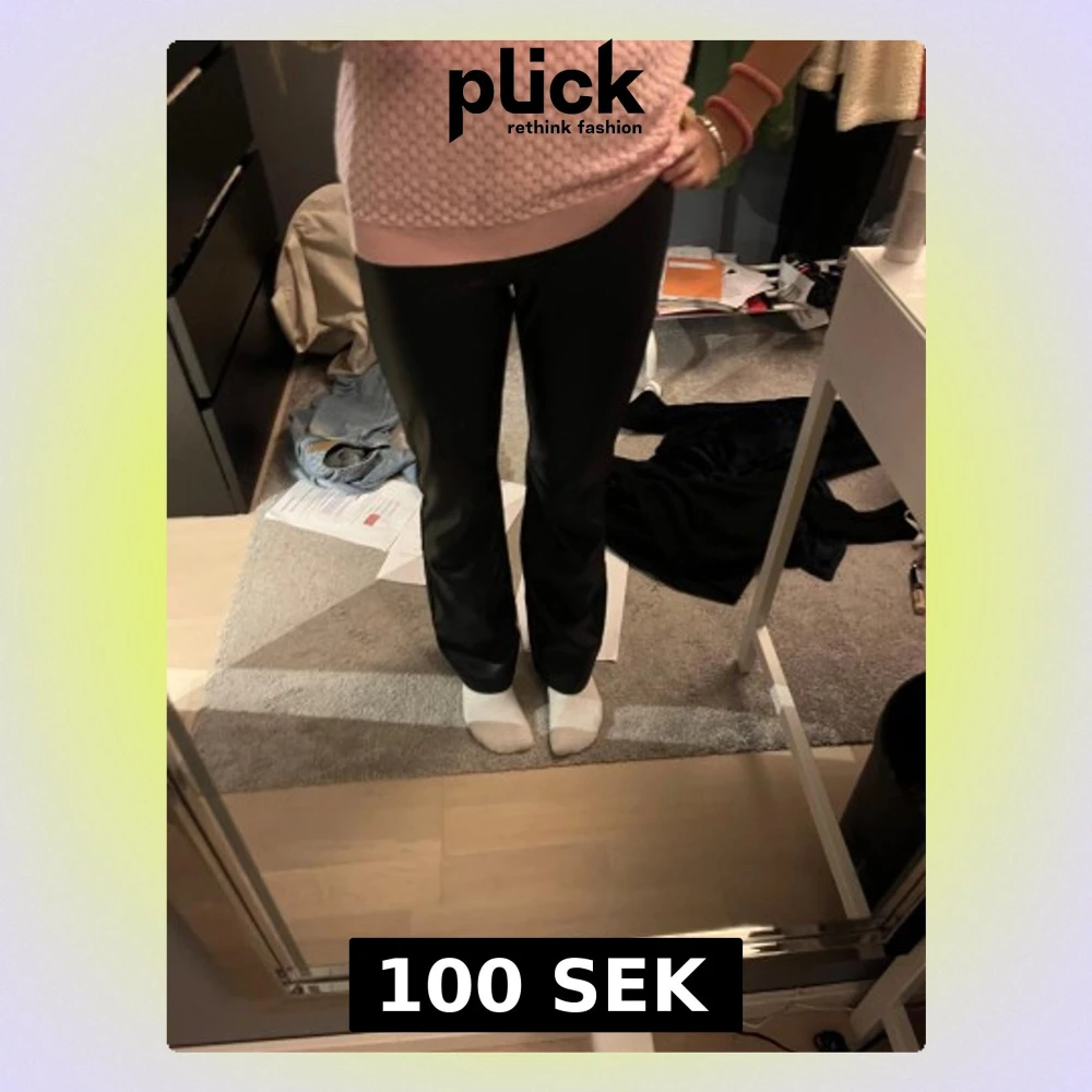 Säljer ett par svarta byxor i skinnimitation med bot cut passform. Byxorna har en snygg, slät yta och sitter tajt över höften och låren, sedan faller de rakt ner mot ankeln. Perfekt för dig som vill ha en cool och stockolmstil look, använd fåtal gånger