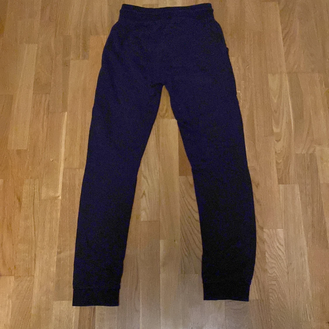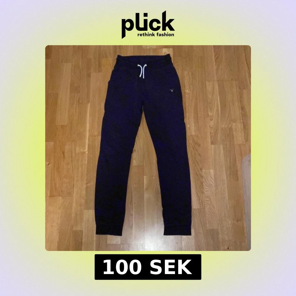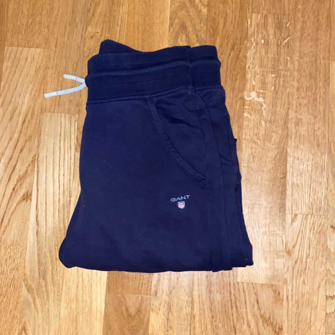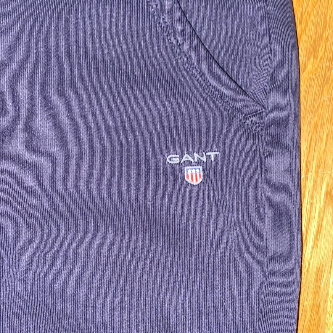 Säljer ett par mörkblå mjukisbyxor från GANT med snörning i midjan och broderad logga på sidan. Perfekta för en avslappnad stil. Storlek 176 - 16 år