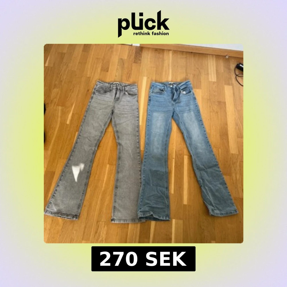Två par bootcut jeans från Denim Day i storlek 170. Ena paret är ljusgrått och det andra är klassiskt ljusblått. Båda har femficksdesign, dragkedja och knapp framtill. Snyggt utsvängda ben och normal passform, perfekta för en avslappnad stil.