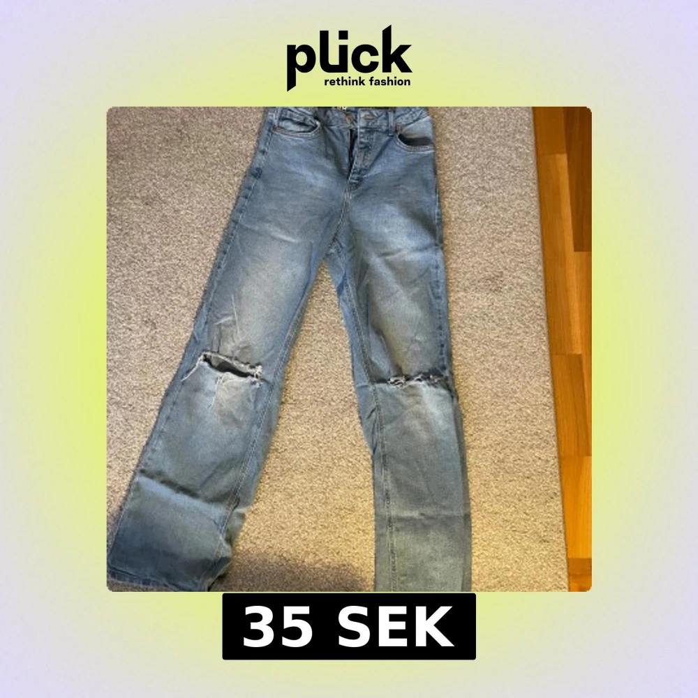 Säljer ett par ljusblå jeans från LAB Industries med raka ben och slitna hål över knäna. Klassisk femficksmodell med normal passform och snygg tvätt. Perfekta för en avslappnad streetstil.