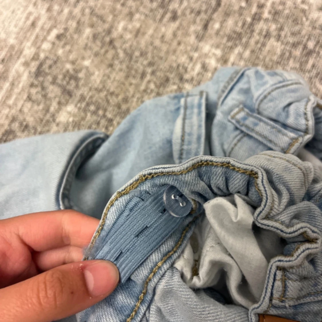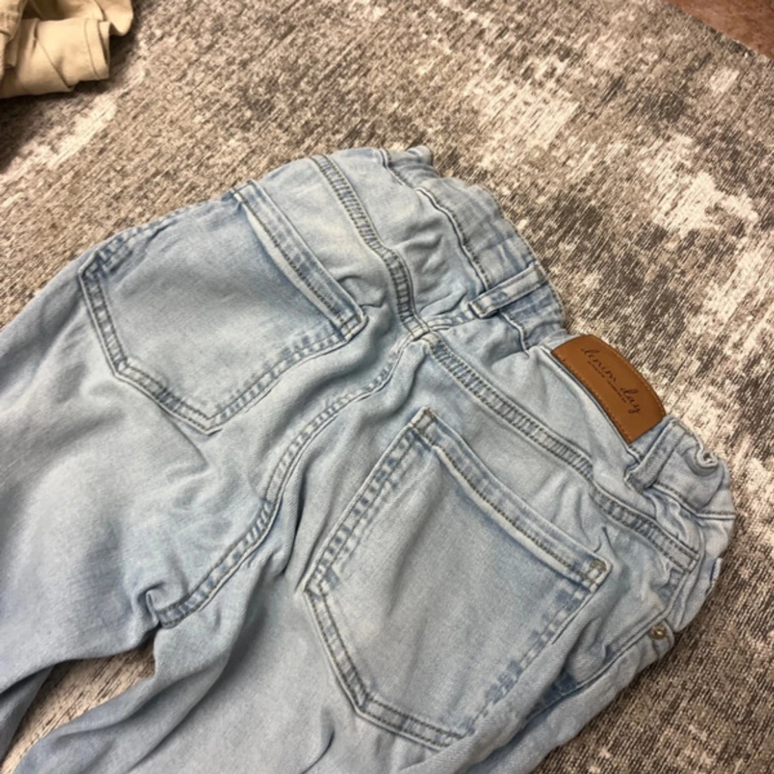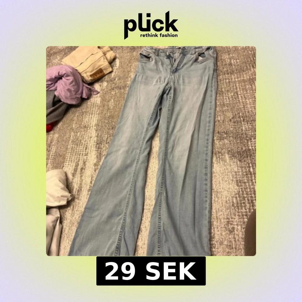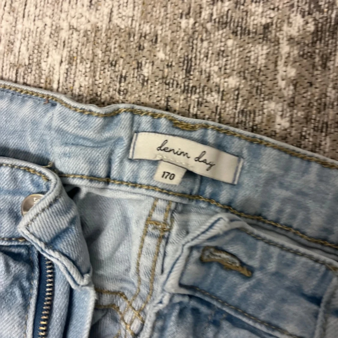 Säljer ett par ljusblå jeans från Denim Day i storlek 170. Byxorna har wide fit, klassiska fem fickor och justerbar midja med resår och knapp på insidan. Perfekta om du gillar en avslappnad och trendig look.