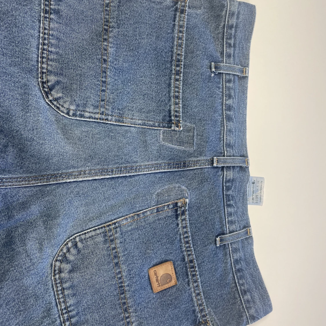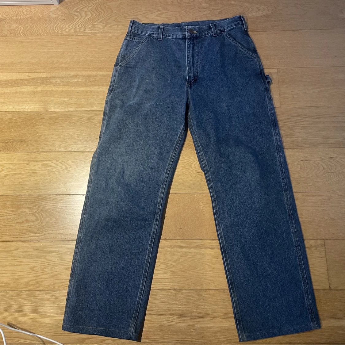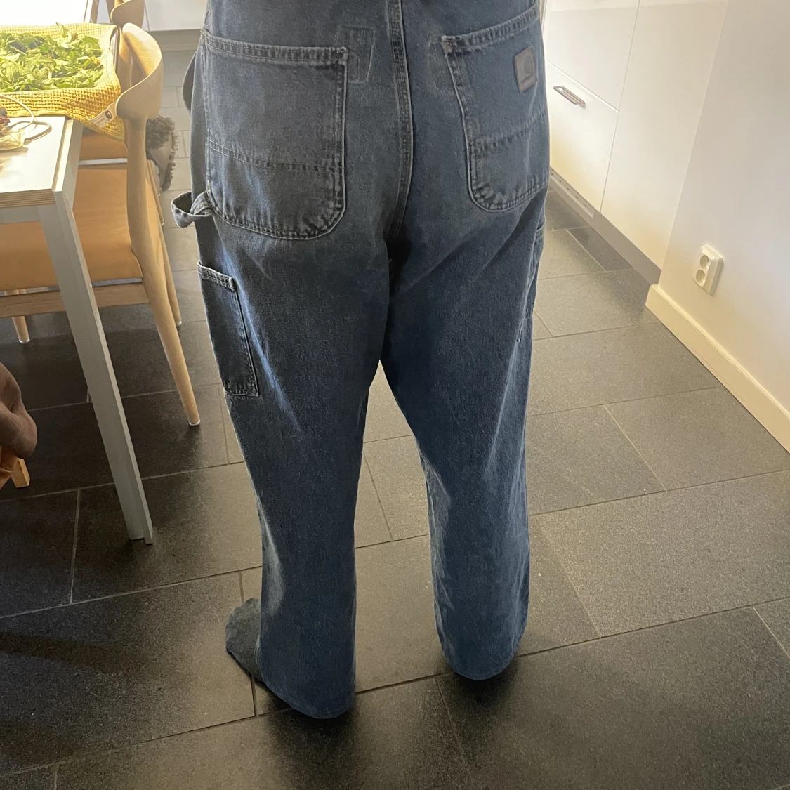 Hej, Säljer mina carhartt jeans då de är för stora för mig. De är dock mycket fina. På baksidan hade de hål som fixats av en sömerska. Det finns även en liten fläck på knät. Midja: 34 tum, 89cm Innerbenslängd: 74cm Ytterbenslängd: 108cm