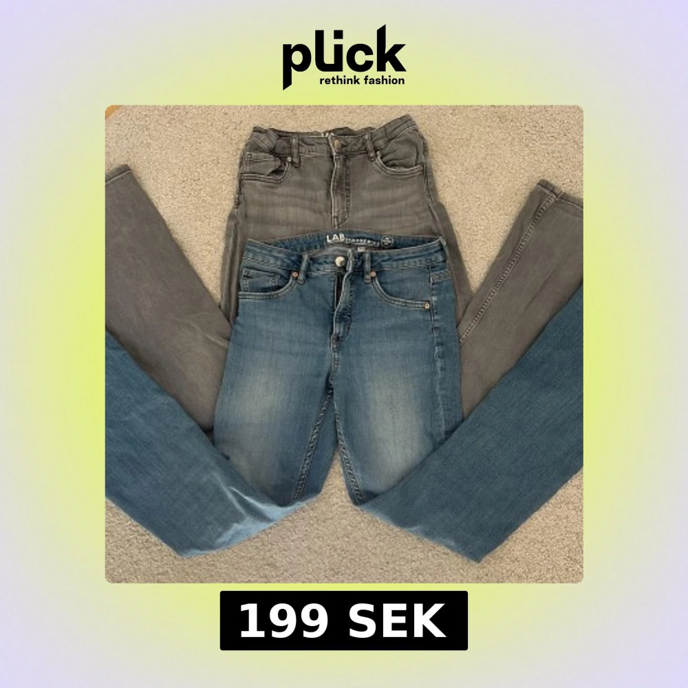 Två par jeans från LAB Industries i storlek 164. Ena paret är klassiskt blå med lätt tvättad look, det andra är grått. Båda har fem fickor, normal passform och är tillverkade i stretchig denim av 99% bomull och 1% elastan. Perfekta för en avslappnad stil.