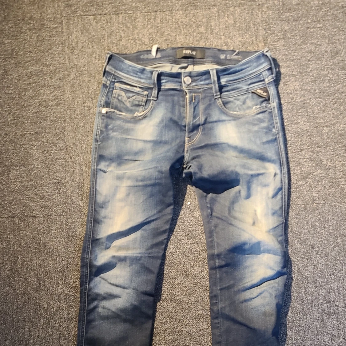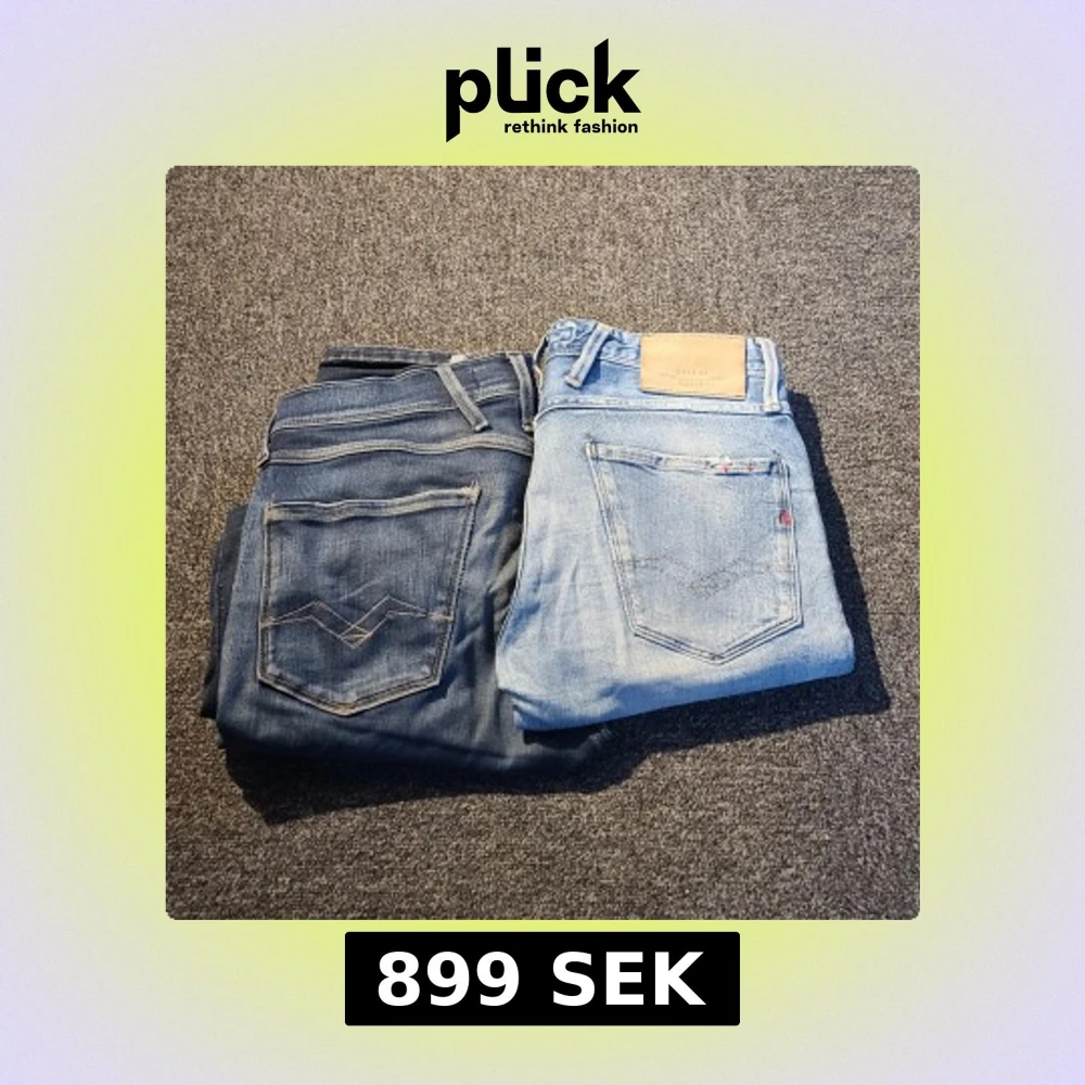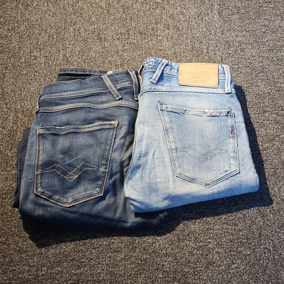 Två par snygga Replay jeans i olika blå tvättar. Ena paret är mörkblå med klassiska bakfickor och den andra är ljusblå med slitningar. Båda har raka ben, femficksmodell och tydliga Replay-detaljer. Perfekta för dig som gillar en avslappnad men stilren look.