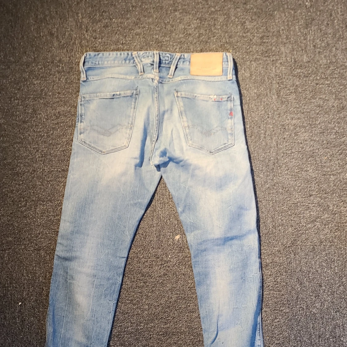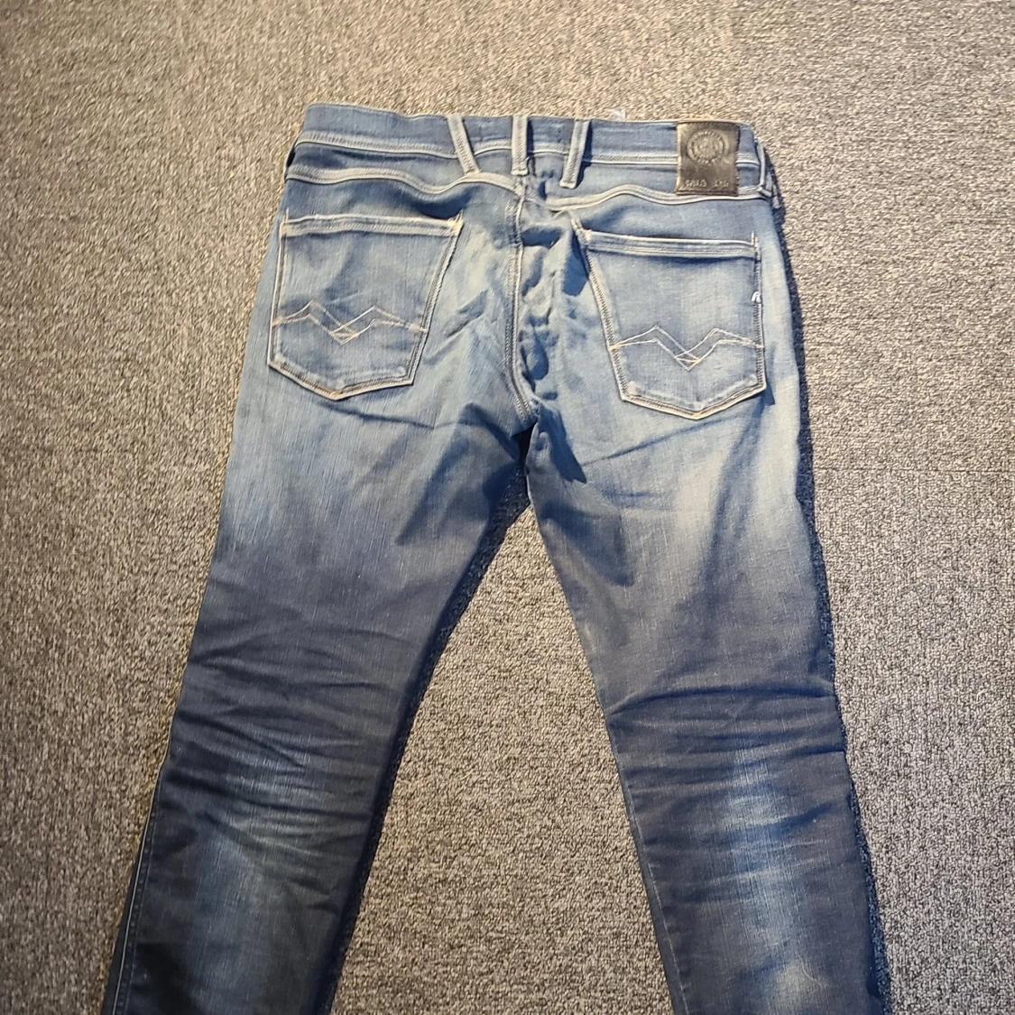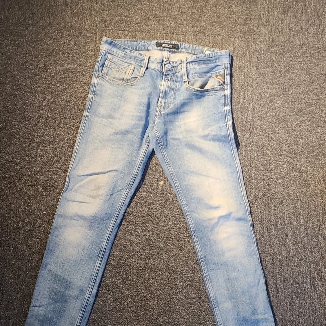 Två par snygga Replay jeans i olika blå tvättar. Ena paret är mörkblå med klassiska bakfickor och den andra är ljusblå med slitningar. Båda har raka ben, femficksmodell och tydliga Replay-detaljer. Perfekta för dig som gillar en avslappnad men stilren look.