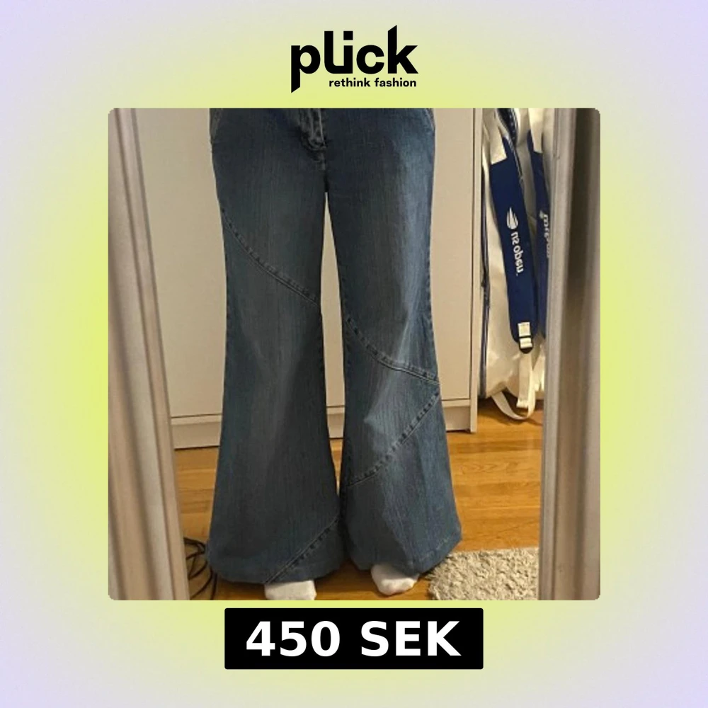 Säljer ett par blå jeans från Bianco Jeans med snygga diagonala sömmar på benen. Jeansen har en wide passform och är tillverkade i bomull med lite stretch. Perfekta för dig som gillar en avslappnad och trendig look.