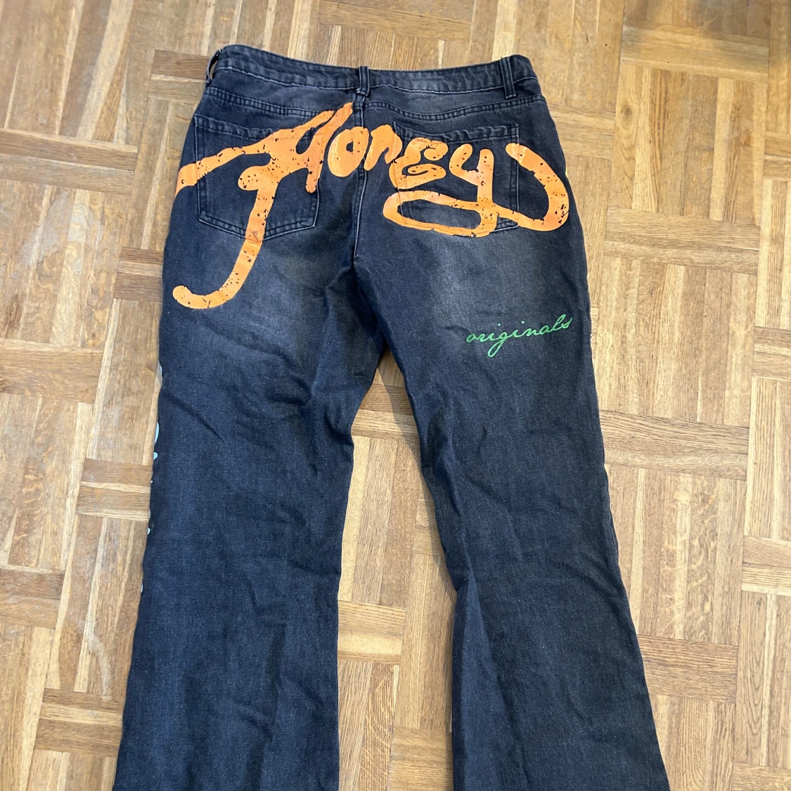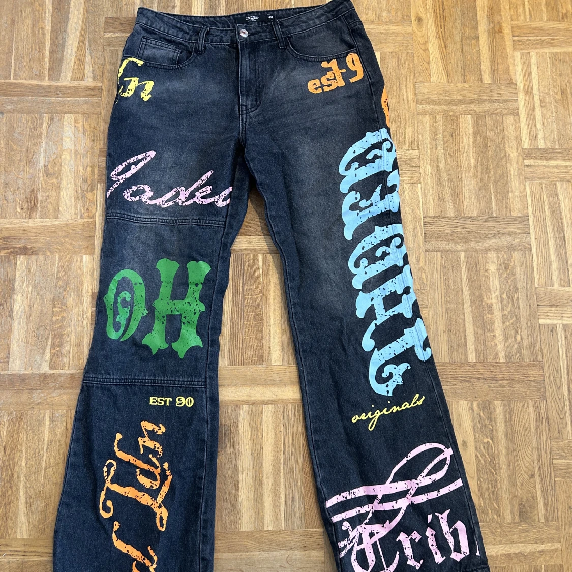 HONEY BUM PRINT LOW RISE JEANS Från JADED! Köpta för något år sedan för 1150kr , säljer då jag inte har använt dem! Skit coola byxor och passformen är jätte snygg, passar mig som är 180cm Kom privat om du har några frågor😋