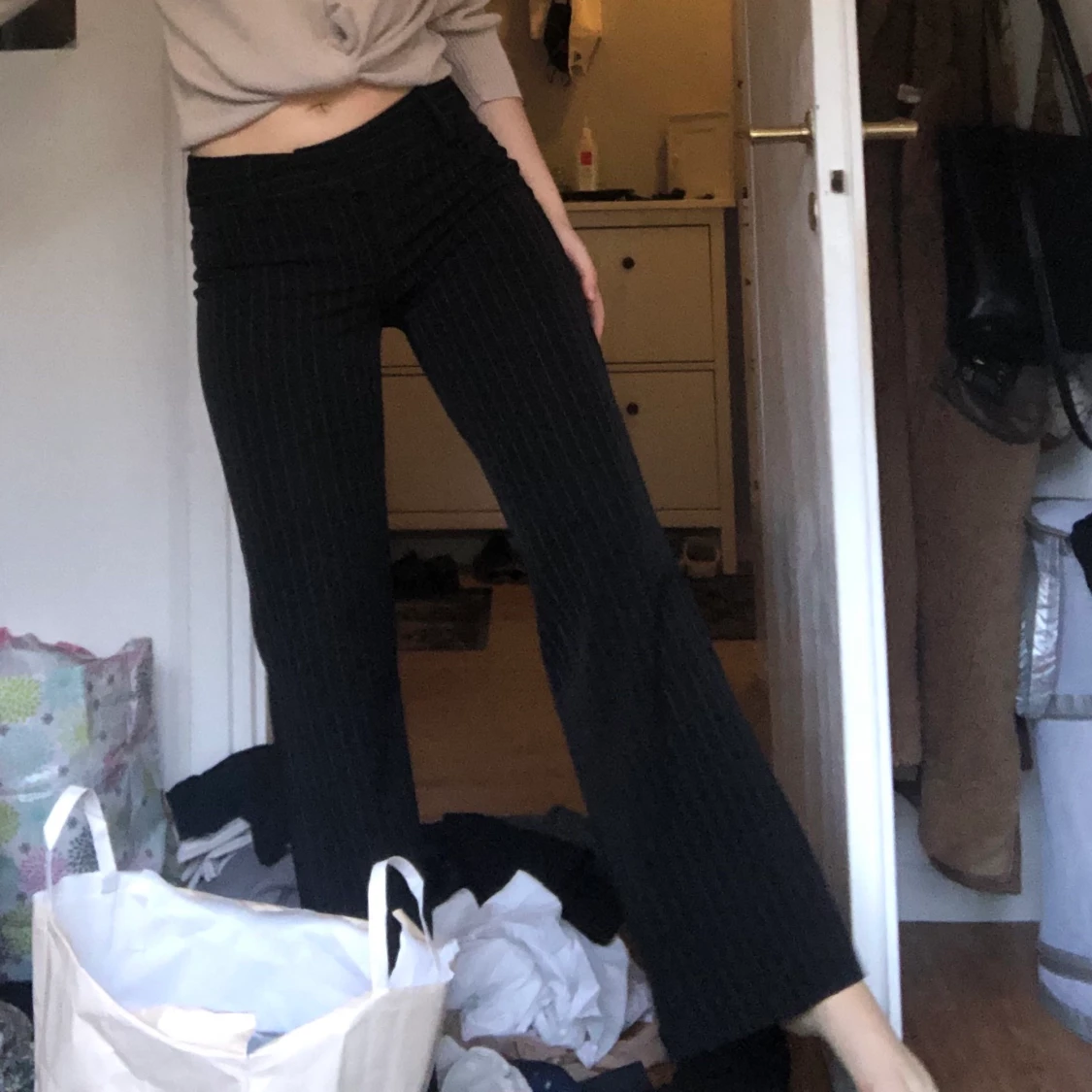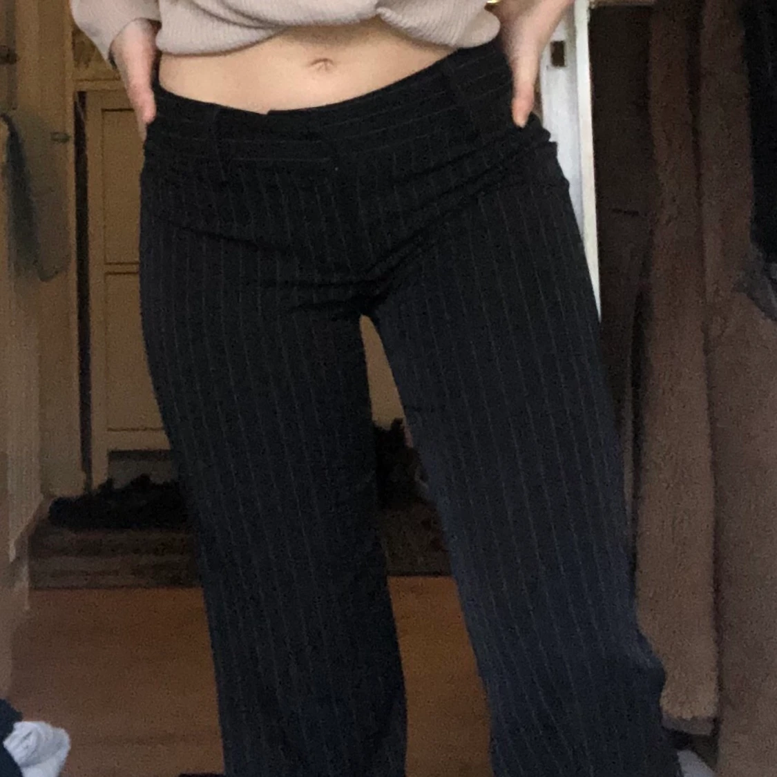 Lågmidjade svarta kostymbyxor med vita ränder. Stretchigt material, storlek står inte, så kontakta mig gärna för mätningar etc.