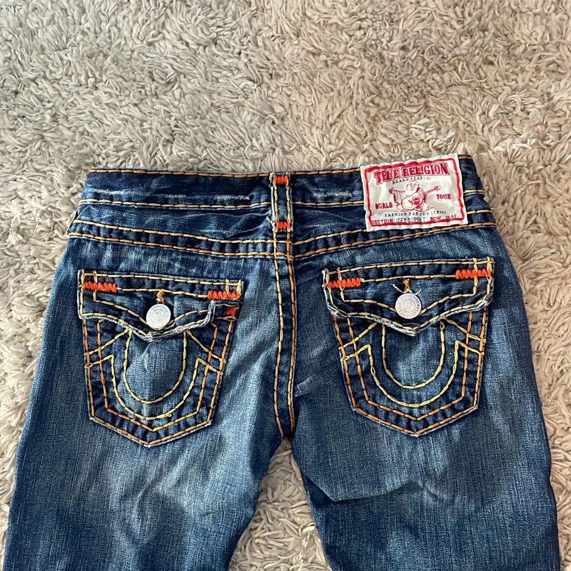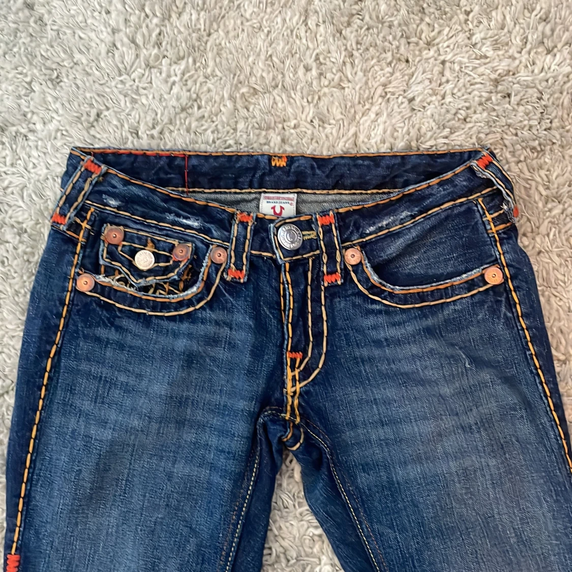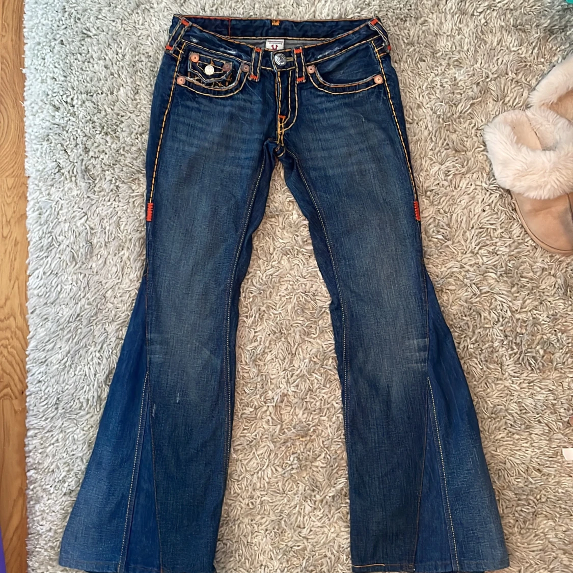 Snygga blå jeans från True Religion med iögonfallande kontrastsömmar i orange och gult. Jeansen är low wasted. Byxorna har en bootcut-stil och är dekorerade med knappar och broderade detaljer på bakfickorna. Perfekta för en cool och avslappnad look. 🫶🫶