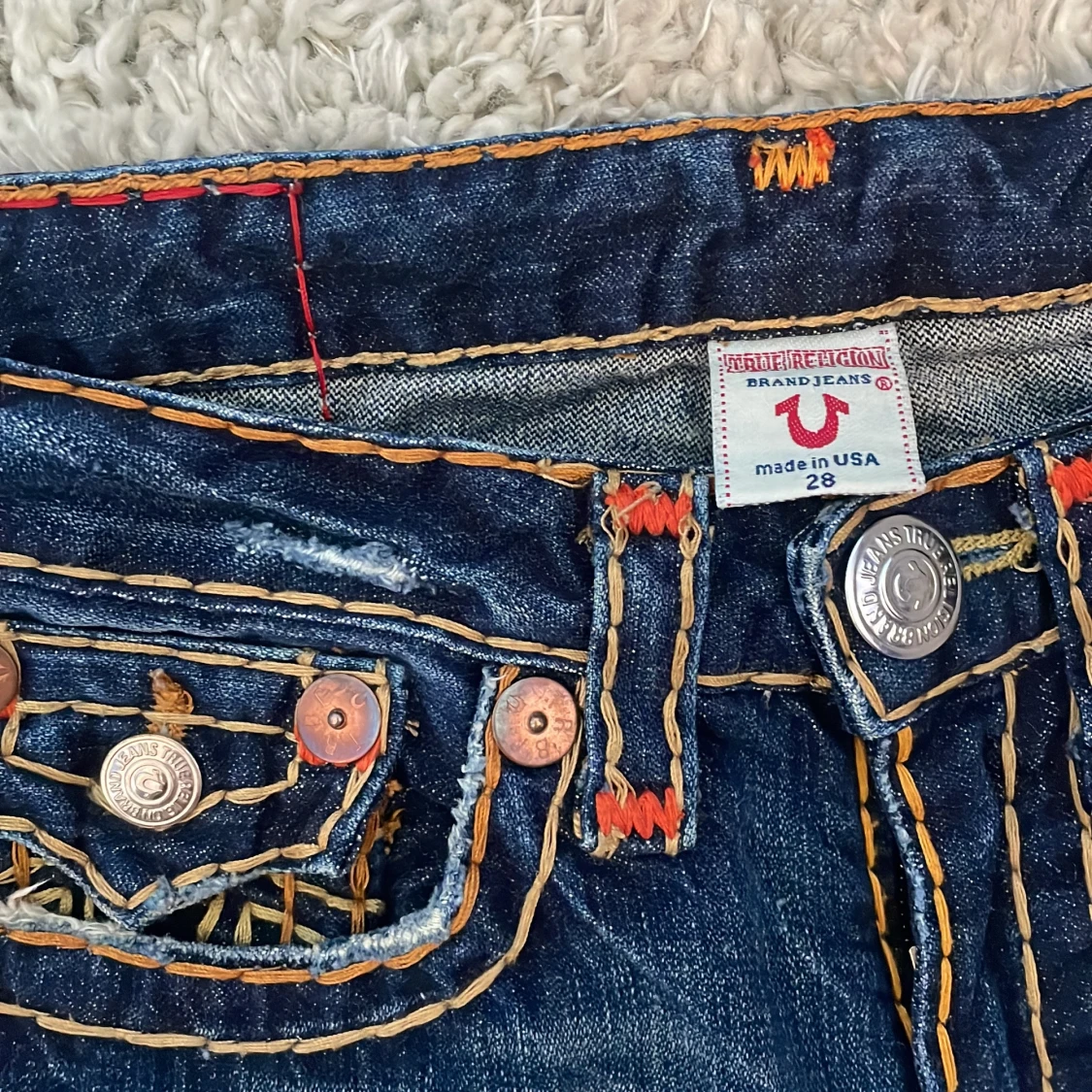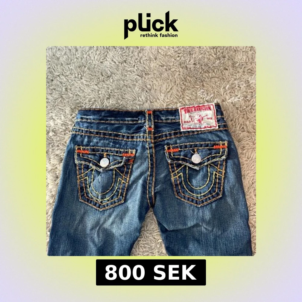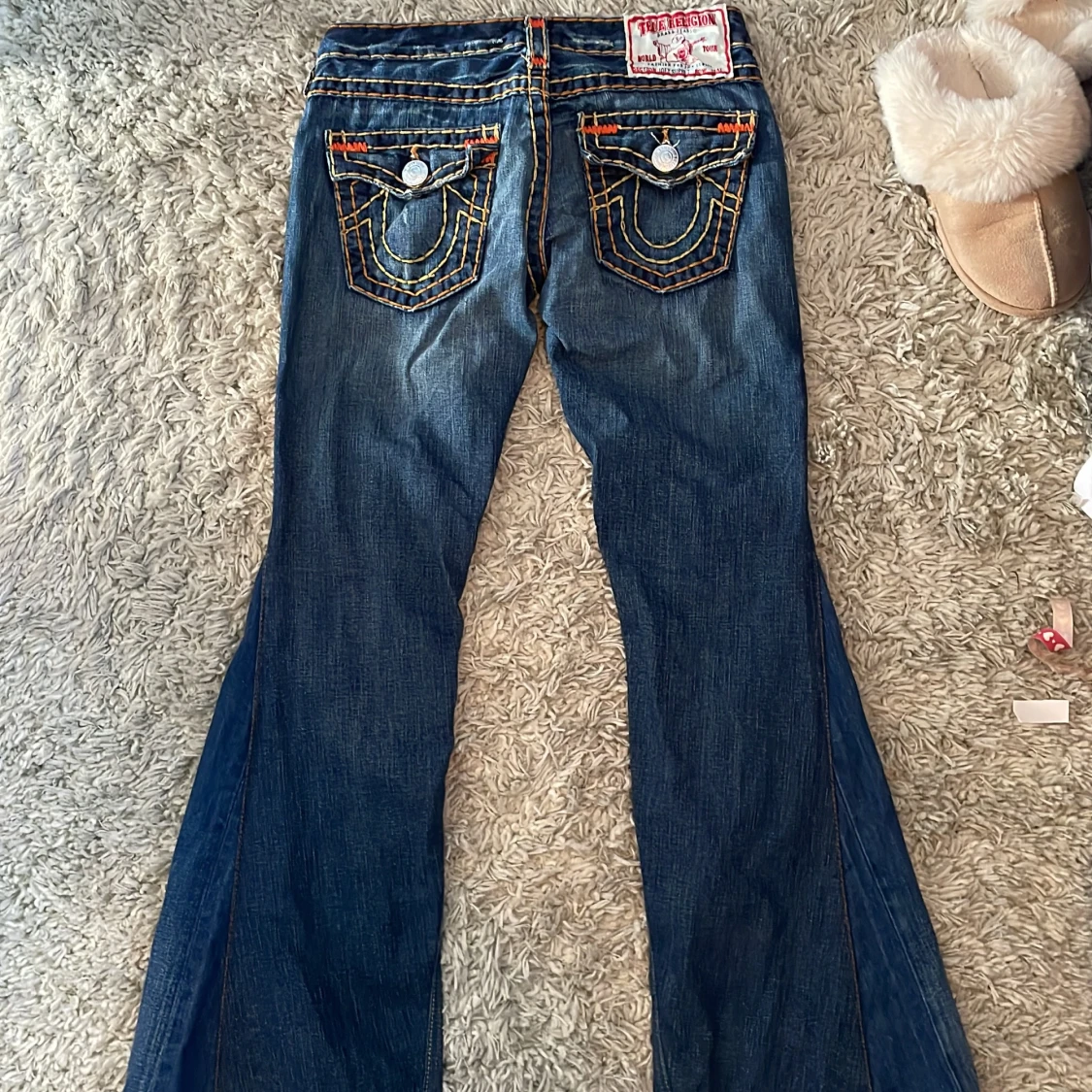 Snygga blå jeans från True Religion med iögonfallande kontrastsömmar i orange och gult. Jeansen är low wasted. Byxorna har en bootcut-stil och är dekorerade med knappar och broderade detaljer på bakfickorna. Perfekta för en cool och avslappnad look. 🫶🫶