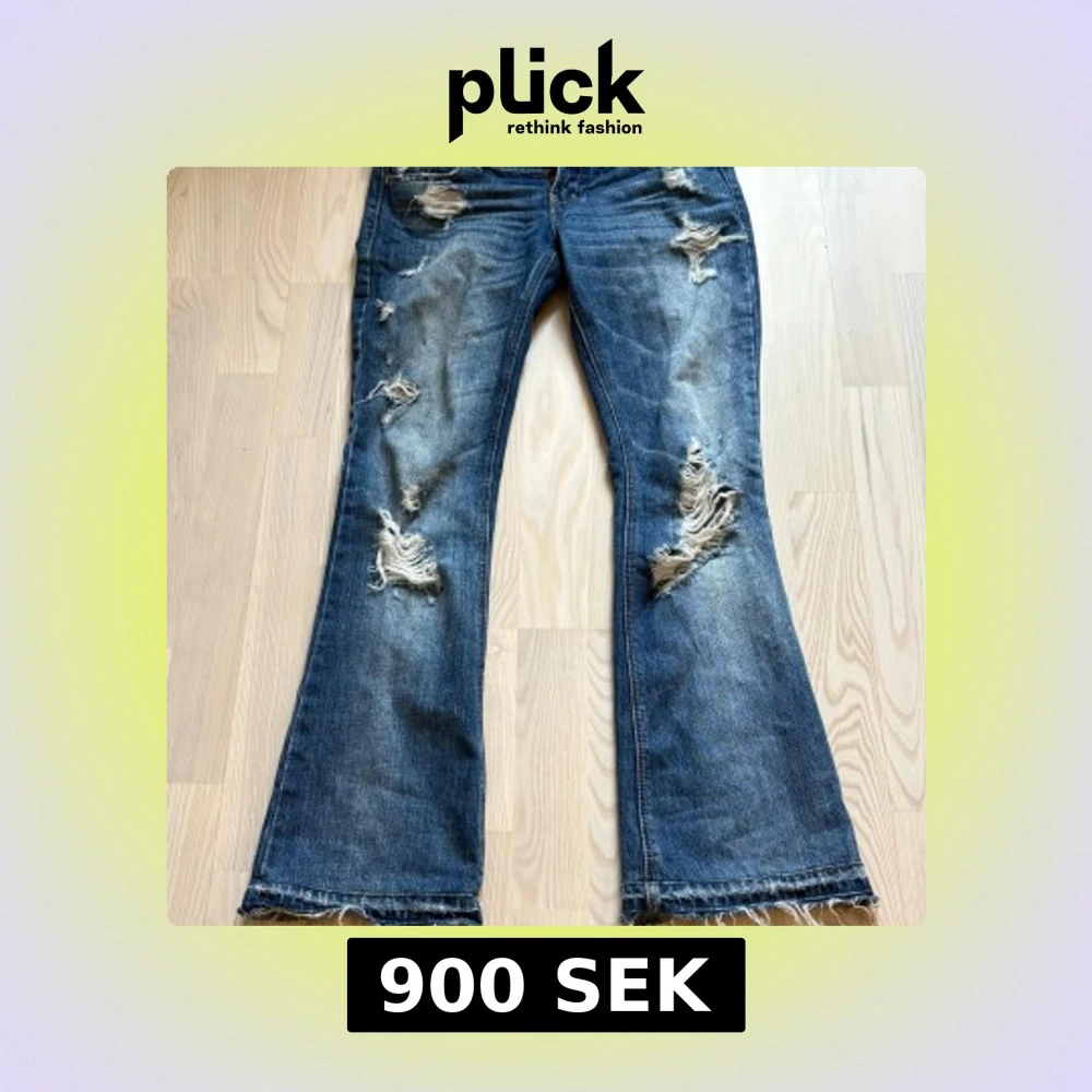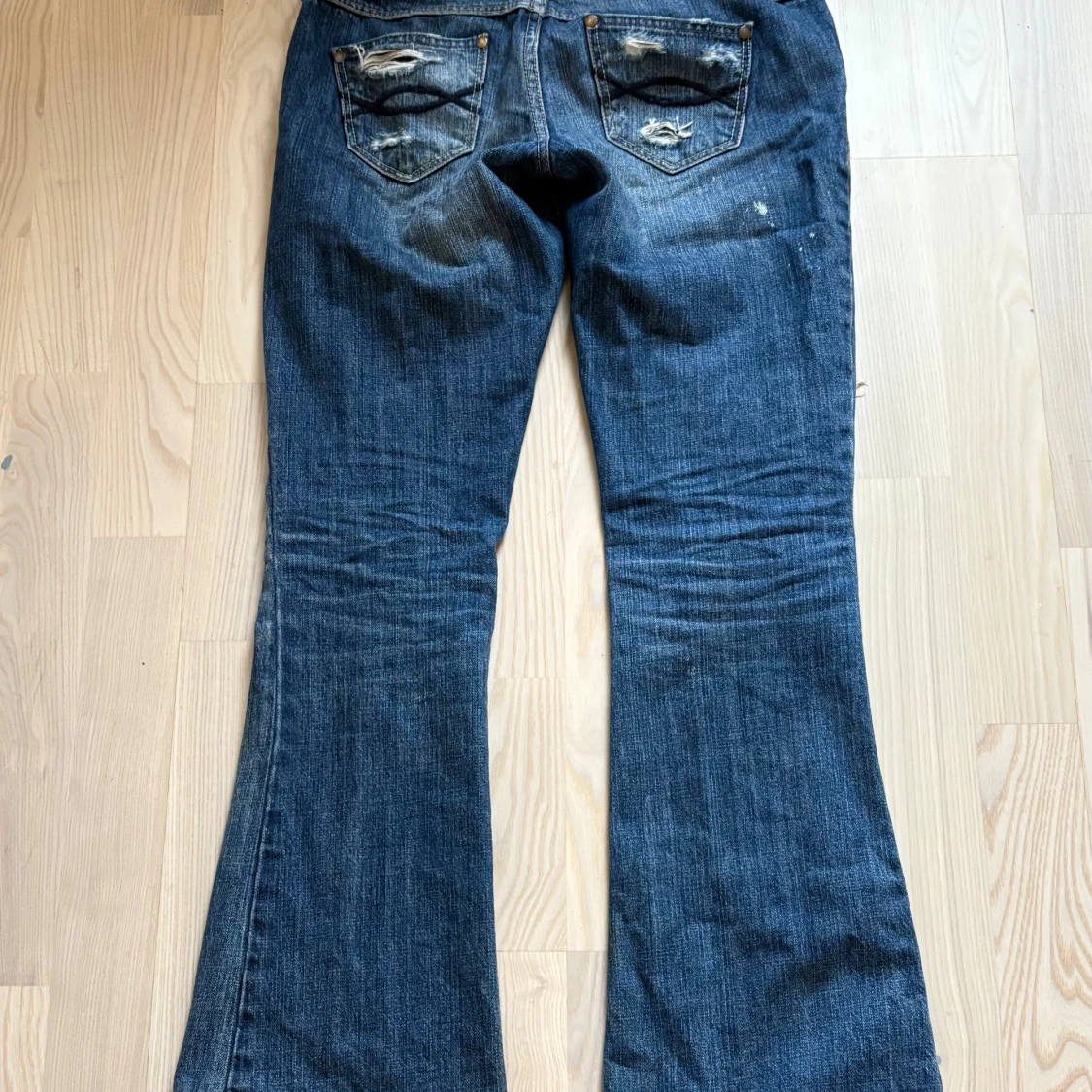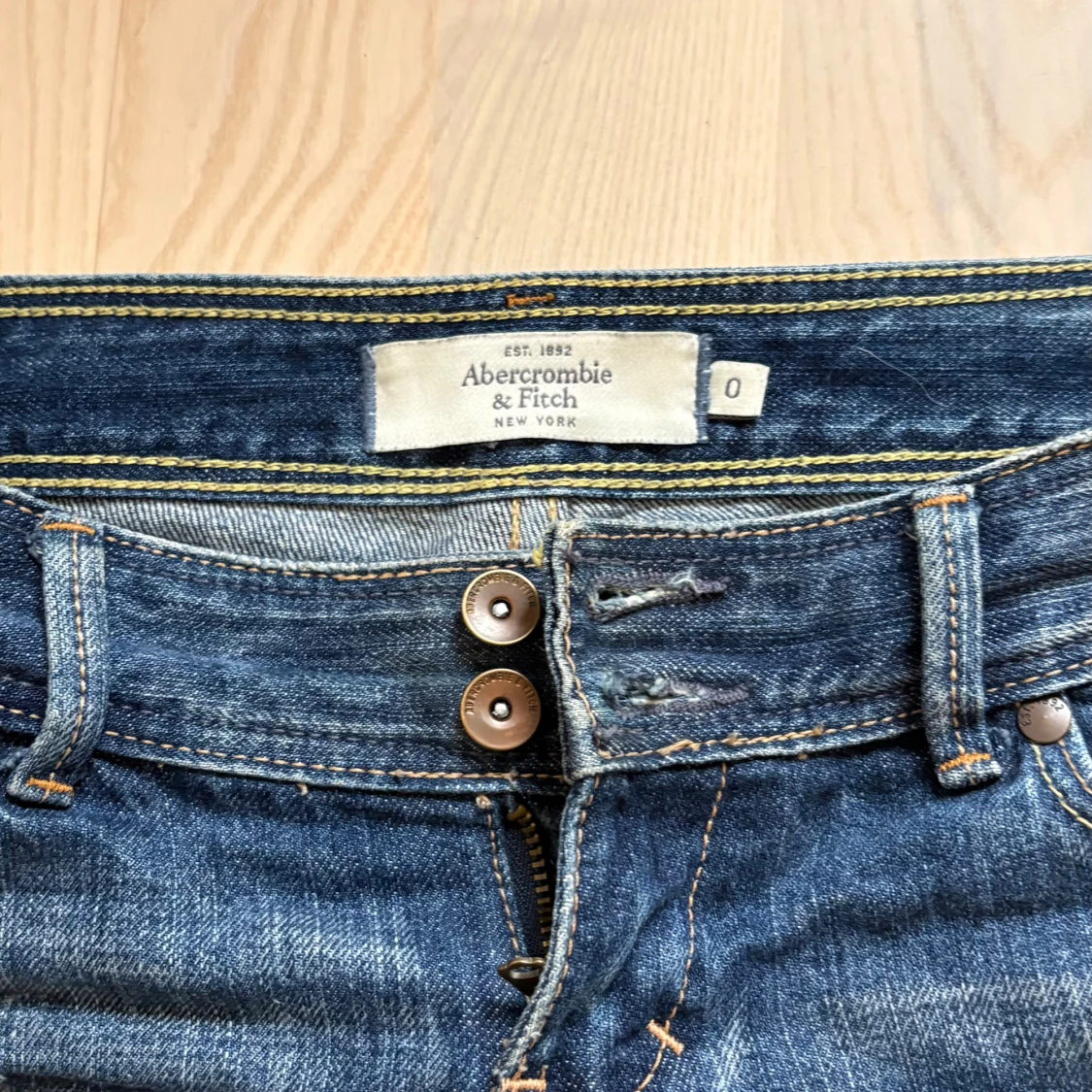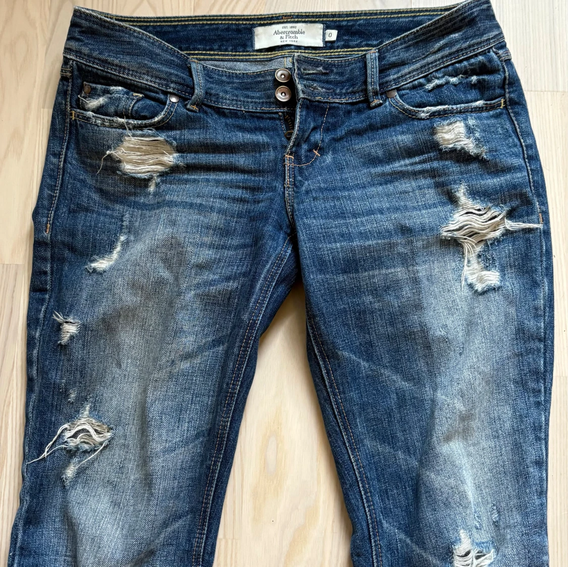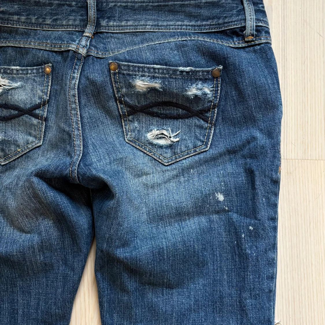 Säljer ett par blå bootcut jeans från Abercrombie & Fitch med slitna detaljer och trasiga partier på både fram- och baksida. Sjukt snygga vintage jeans i bra skick med tanke på ålder! köpta på vinted, tyvärr lite för små för mig Storlek 0, alltså 32/XS Midjemått: 38cm Innerbensmått: 73cm ytterbensmått: 95cm Benöppning: 23cm