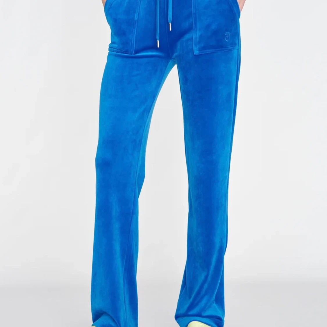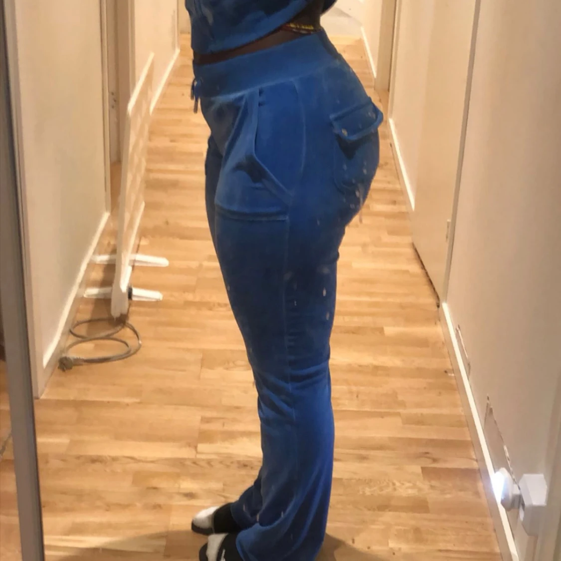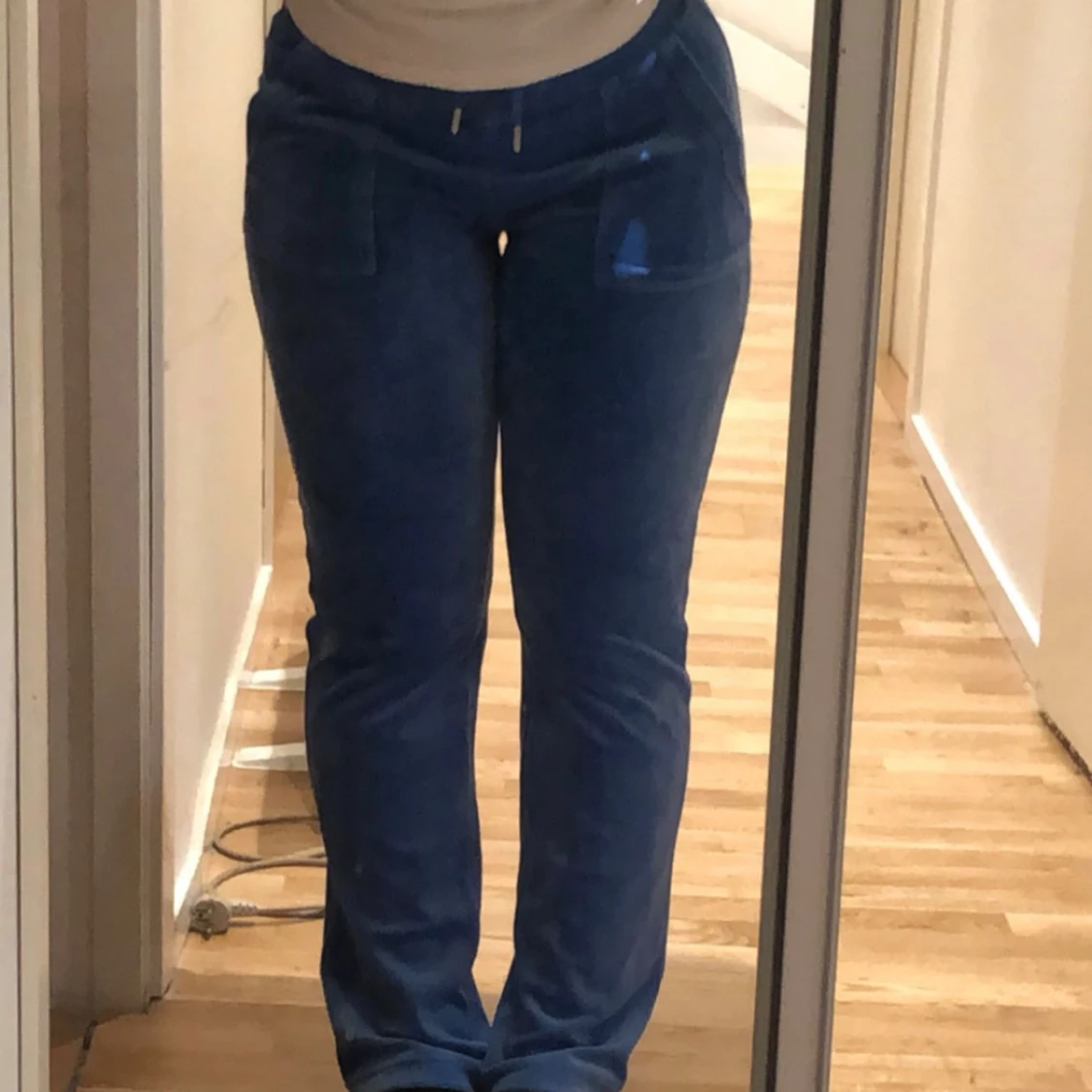 Säljer ett par blå juicy couture byxor med bootcut-snitt. Byxorna har klassiska fickor fram och bak samt att back fickorna är i god skikt och är tillverkade i mjuk velour som ger en skön känsla. Perfekta för dig som gillar y2k och vill hålla sig farm för vintern!