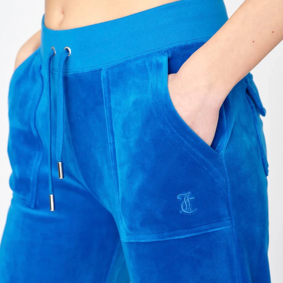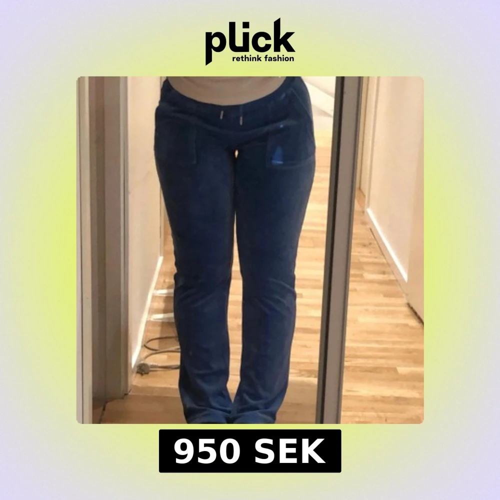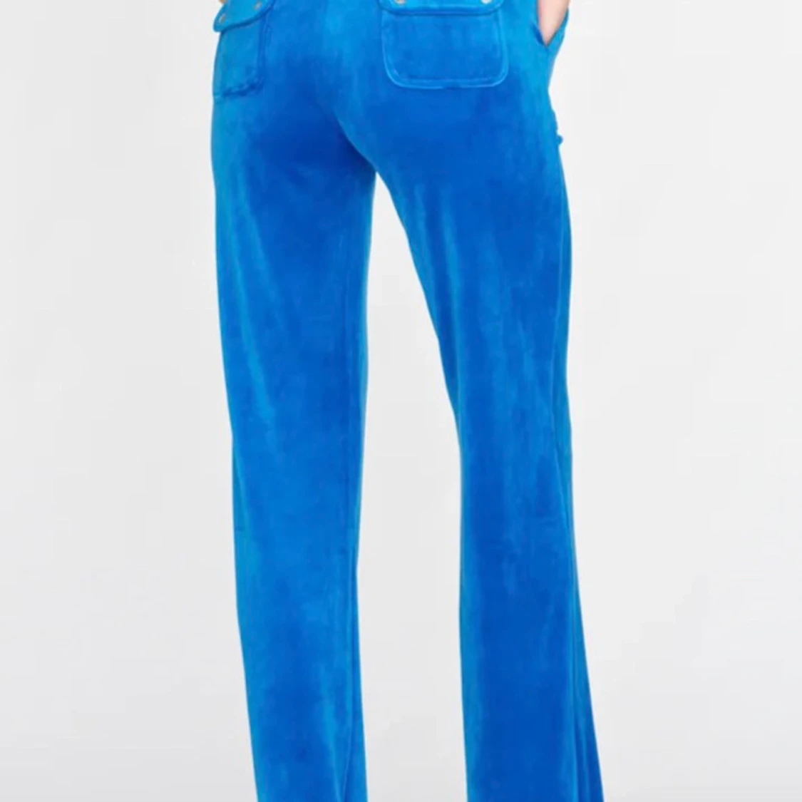 Säljer ett par blå juicy couture byxor med bootcut-snitt. Byxorna har klassiska fickor fram och bak samt att back fickorna är i god skikt och är tillverkade i mjuk velour som ger en skön känsla. Perfekta för dig som gillar y2k och vill hålla sig farm för vintern!