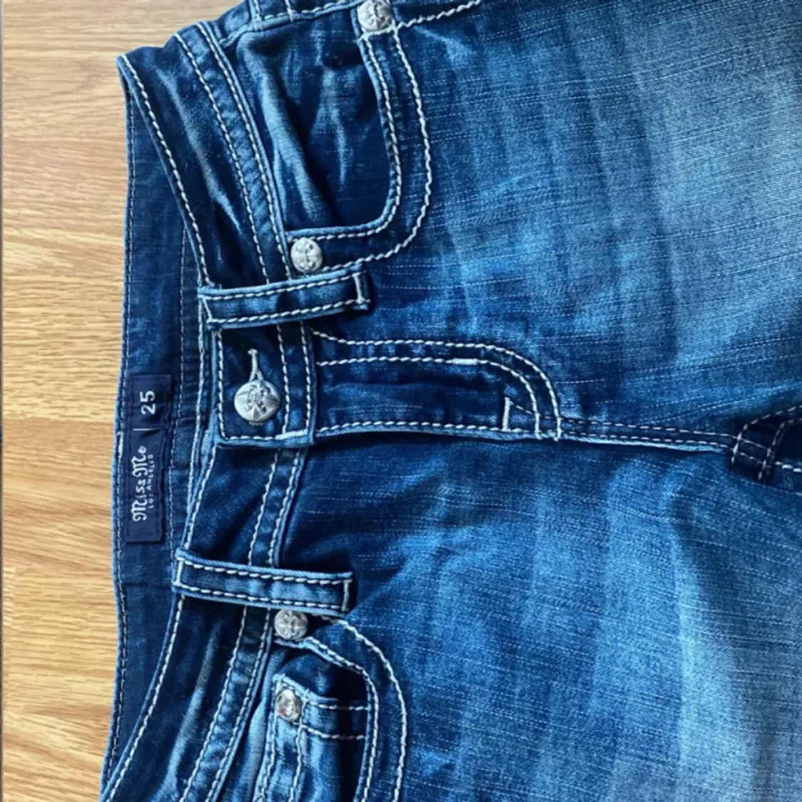 Snygga blå jeans från Miss Me med bootcut-modell och broderade bakfickor med paljetter och detaljer i silver. Jeansen har låg midja och klassisk femficksdesign. Perfekta för dig som vill sticka ut med coola detaljer och unik look.🪩🌸🩷