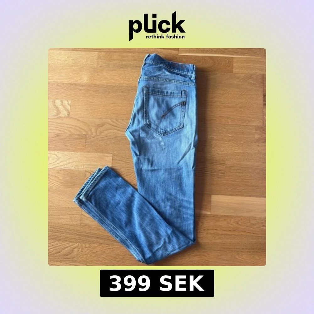 Säljer ett par ljusblå Dondup George jeans med coola slitningar. Jeansen har klassisk femficksdesign, kontrastsömmar och är tillverkade i skönt denimtyg. Perfekt för dig som gillar en avslappnad och trendigstil.