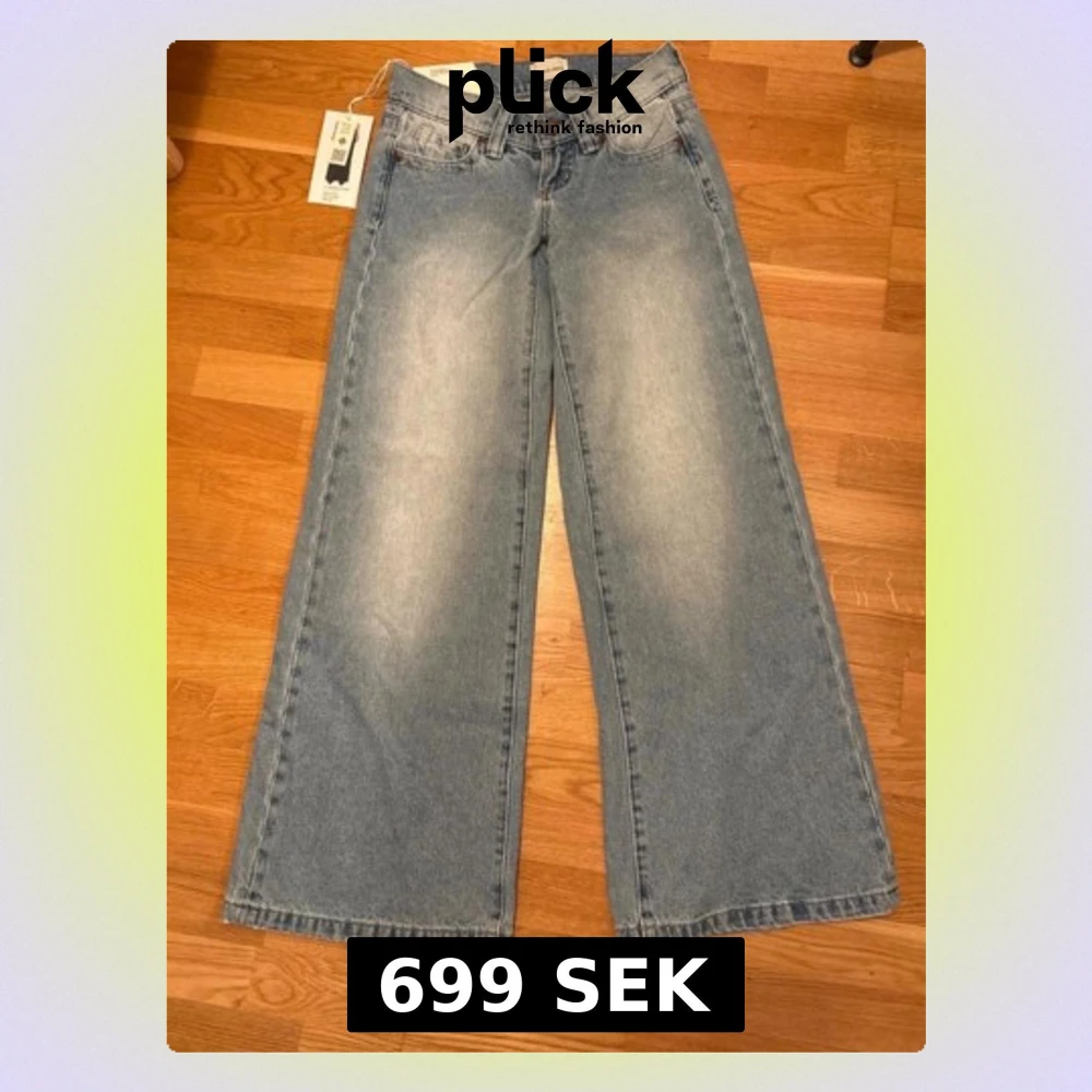 Säljer ett par ljusblåa jeans från nelly som är helt nya! skit snygga som e lowwaist och lita baggy 💥det ser ut som de har nån grön fläck typ på baksidan av byxan men det är bara ljuset och det är ingen fläck! frågor kan diskuteras privat