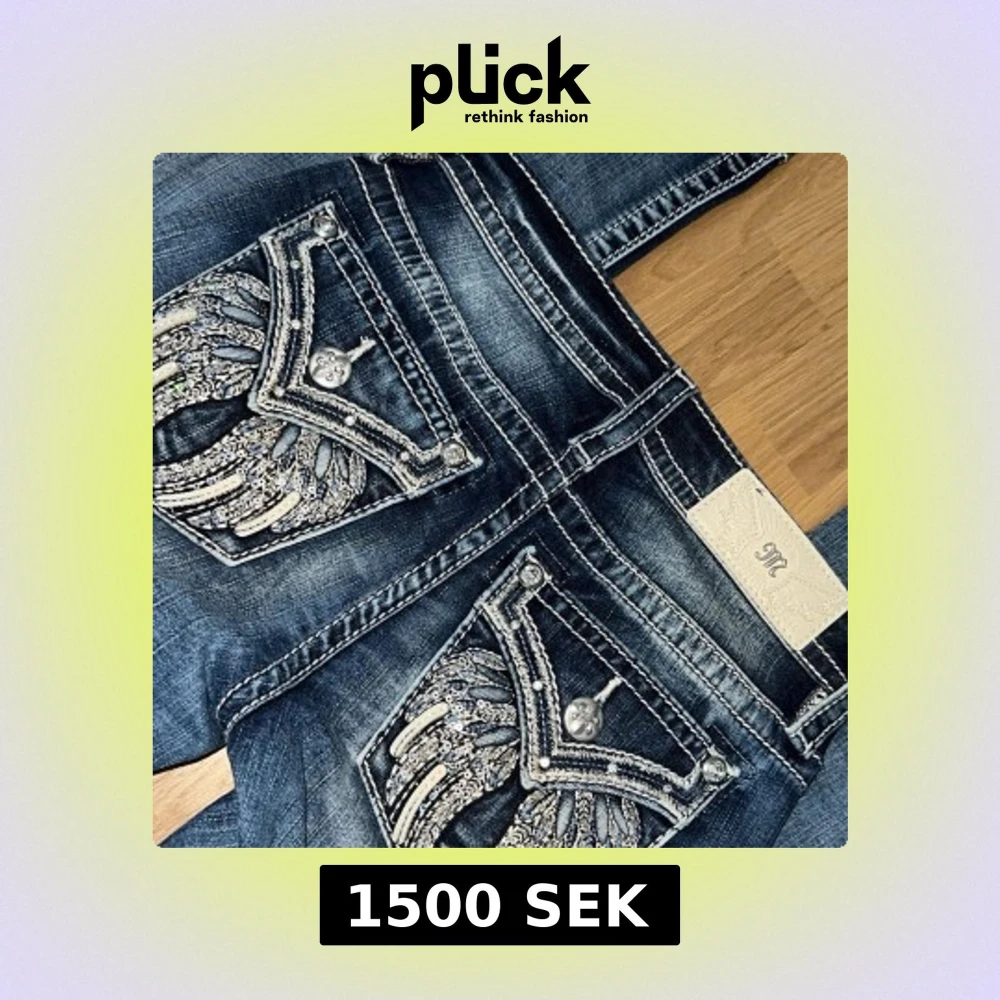 Helt nya jeans från Miss Me med unika paljettdetaljer på bakfickorna. Jeansen har en bootcut-stil och är dekorerade med glittriga knappar och kontrastsömmar. Perfekta för att ge din outfit det lilla extra. Dom är i storlek 23 och i längd 32