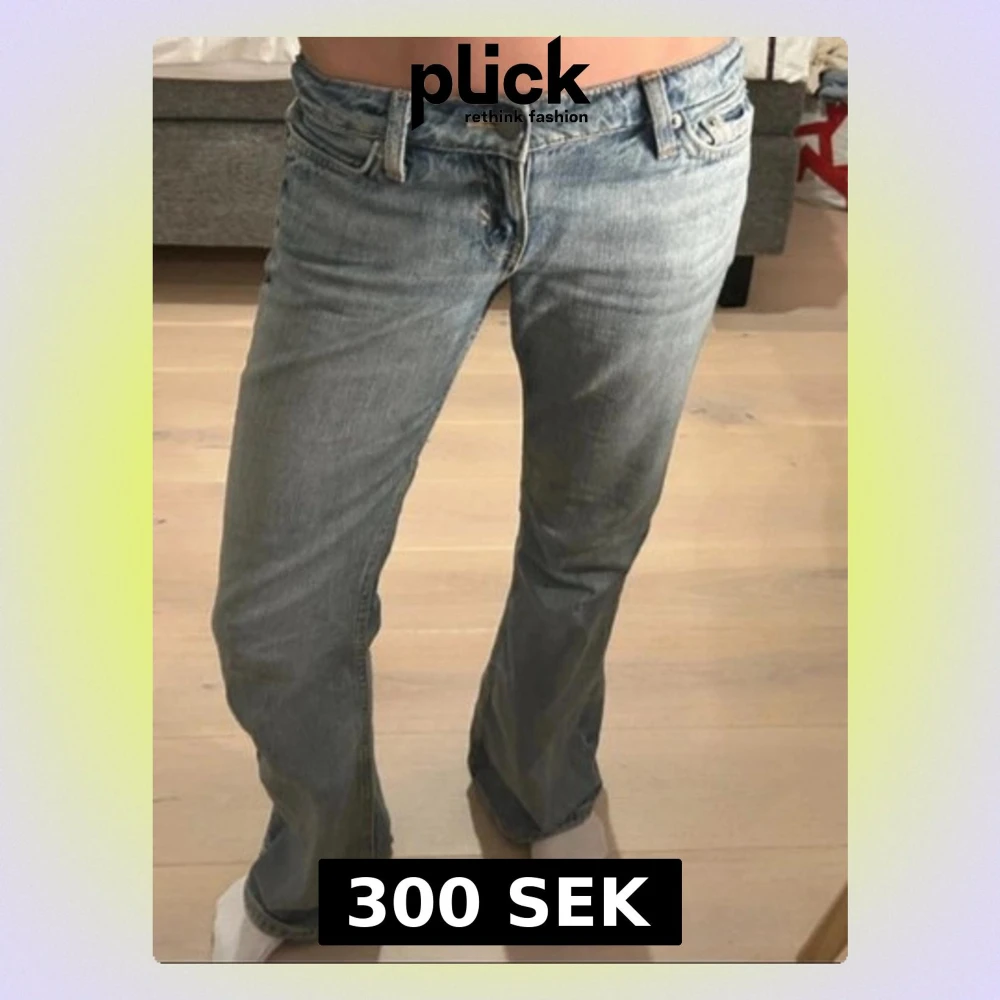 Säljer ett par ljusblå jeans med klassisk bootcut passform. Jeansen har låg midja och är tillverkade i ett mjukt denimtyg. Perfekta för dig som gillar en avslappnad och retro look.