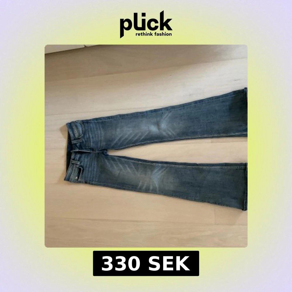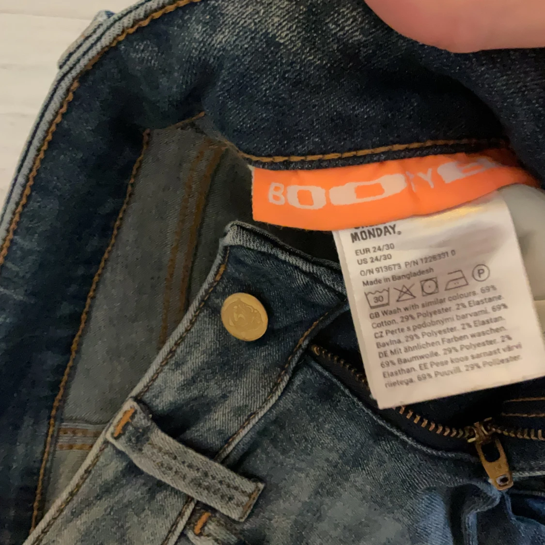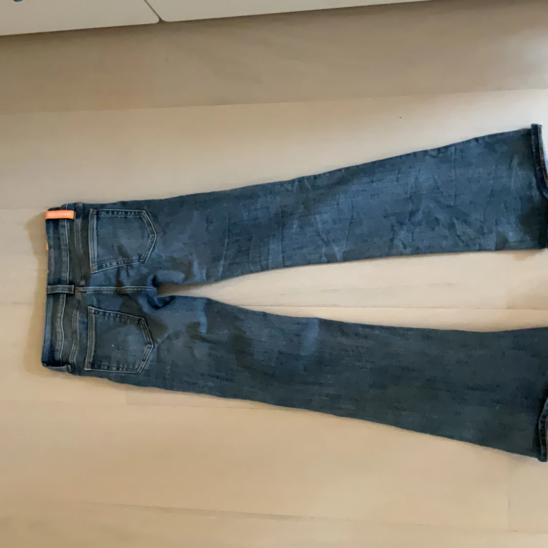 Säljer ett par blå bootcut jeans från Monday med klassisk femficksdesign och orange detalj i midjan. Jeansen har snygga slitningar framtill och är tillverkade av bomull, polyester och elastan för skön stretch. Perfekt passform och cool tvätt.