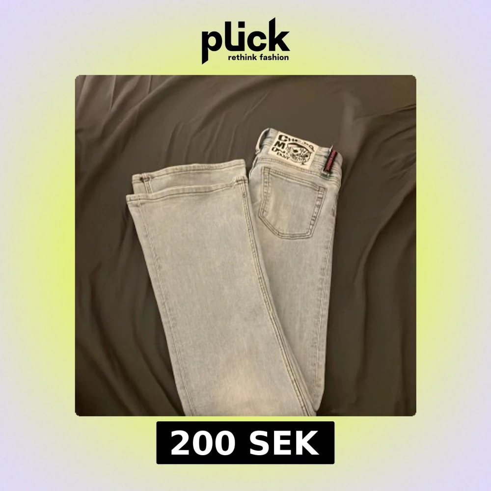 Säljer ett par ljusblåa jeans från Cheap Monday med bootcut-snitt och låg midja. Jeansen har klassisk femficksdesign, dragkedja och knapp framtill samt en snygg logotyp på bakfickan.