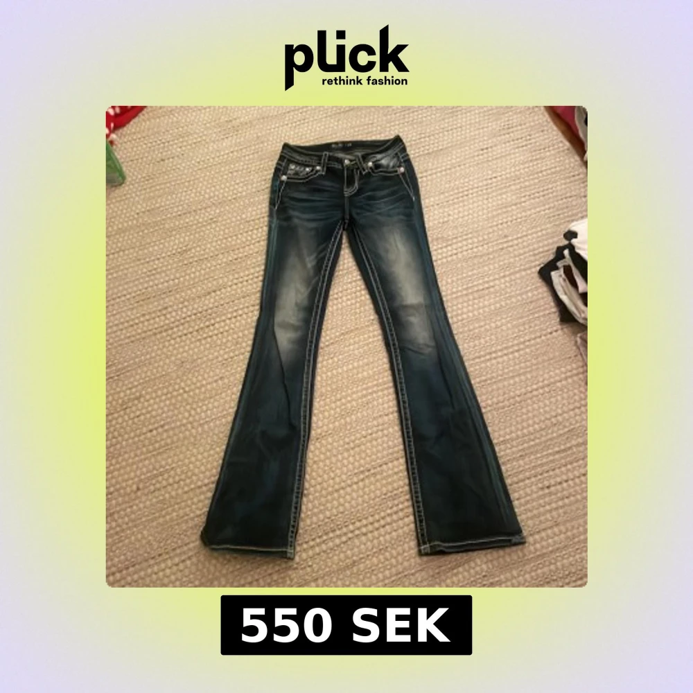 Snygga blå jeans med bootcut-stil och coola broderade detaljer på bakfickorna. De har en låg midja och framträdande sömmar som ger en unik look. Perfekta för dig som vill sticka ut!