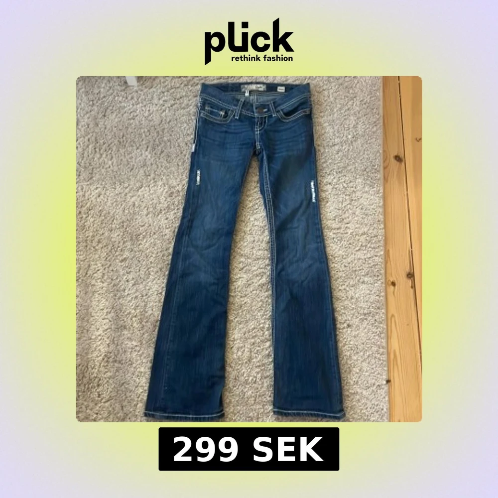 Snygga blå bootcut jeans från BKE med dekorativa sömmar på bakfickorna. Jeansen har låg midja och klassisk femficksdesign med knappar och dragkedja framtill. Perfekta för en avslappnad stil.