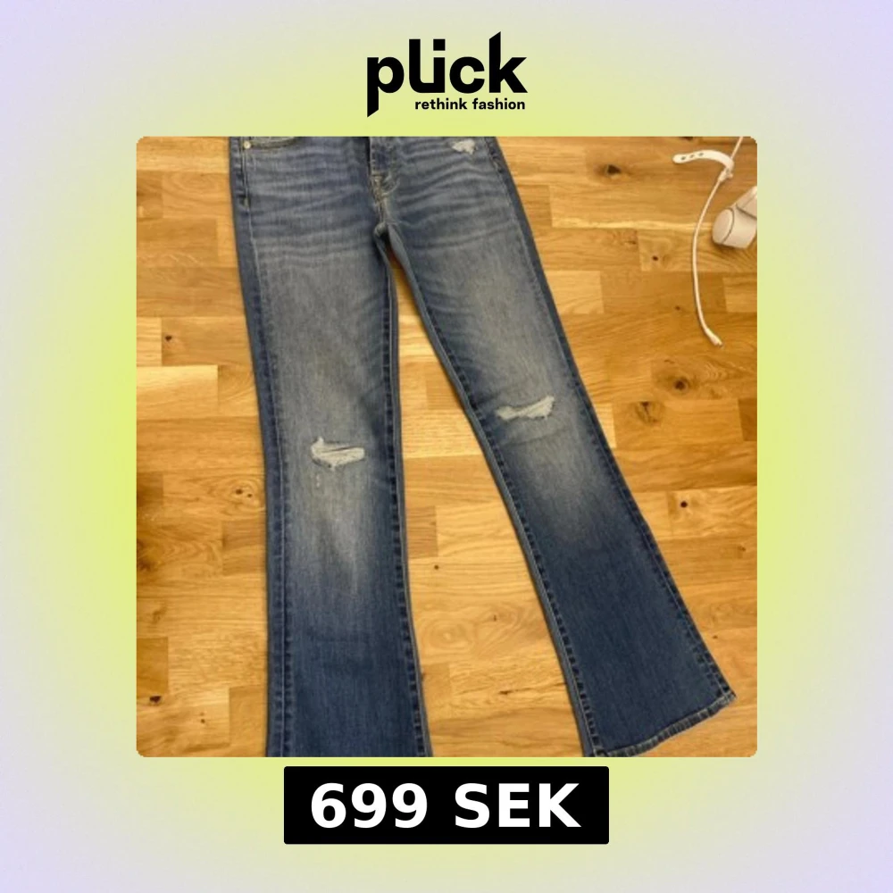 Snygga blå bootcut jeans från 7 For All Mankind med slitna detaljer. Tillverkade av japanskt tyg, dessa jeans har en klassisk femficksdesign och dragkedja. Perfekta för en avslappnad stil med en touch av edge. Aldrig använda. Nypris:över 2000kr