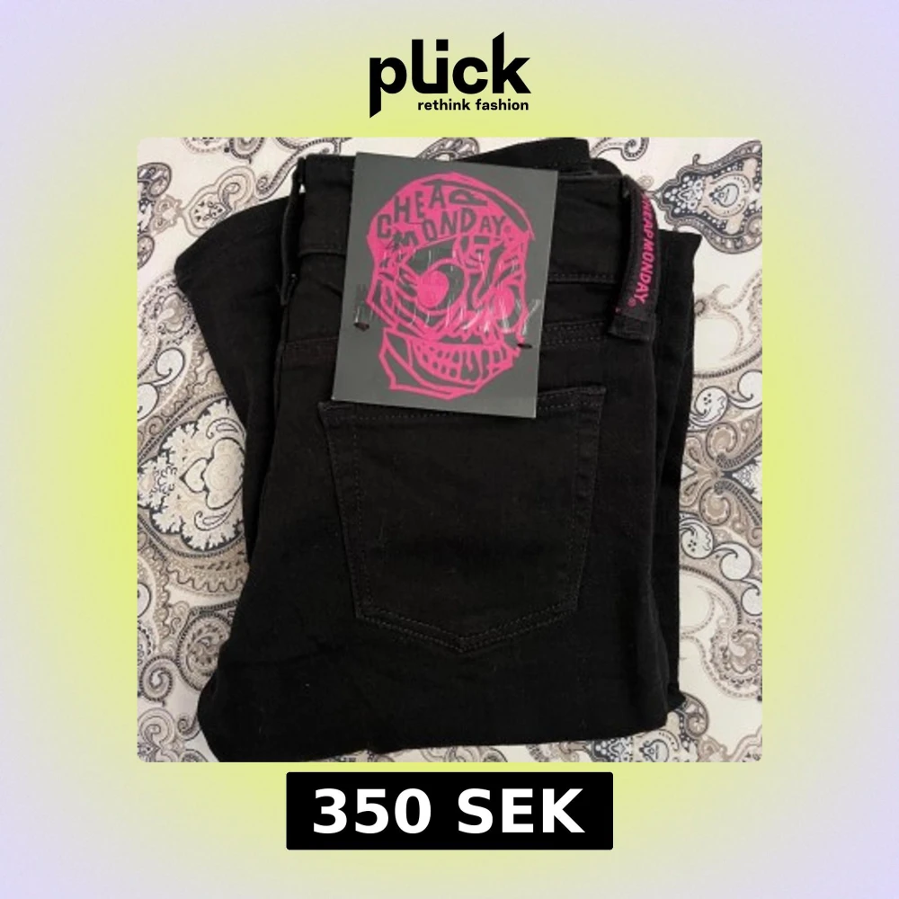 Svarta Cheap Monday jeans med bootcut-modell och low waist. Som man ser på bilden är lappen kvar då de är helt oanvända, beställde fel storlek💗