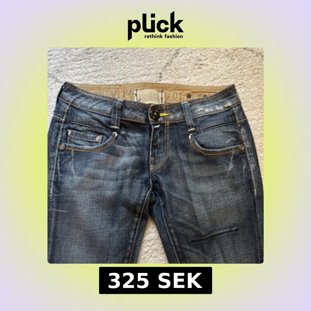 Snygga mörkblå jeans från G-Star Raw med coola broderade detaljer på bakfickorna och slitna effekter. Klassisk femficksmodell med orange kontrastsömmar och raka ben. Perfekta för dig som gillar streetstyle och vill ha ett par unika jeans. Nypris runt 1000kr och knappt använda. Hör av er vid frågor!