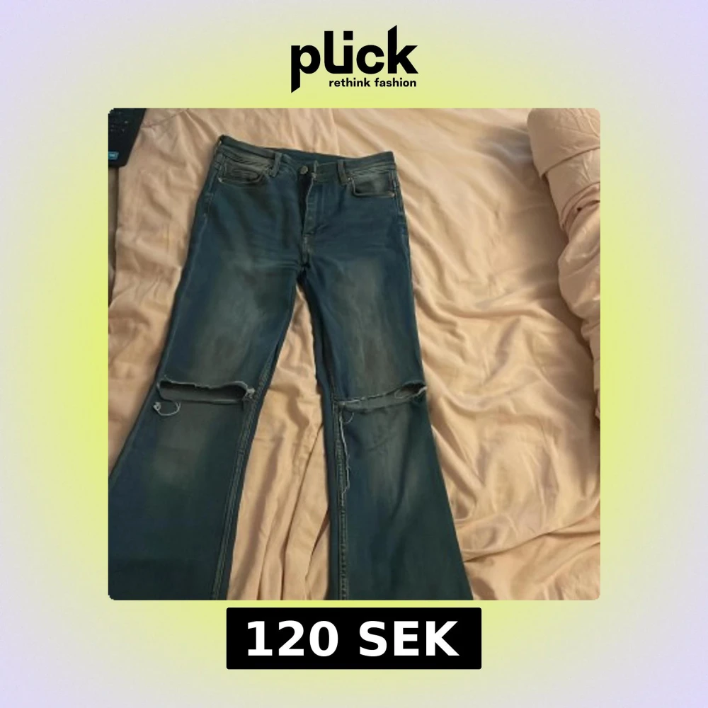 Snygga blå flare jeans från Denim med hål i knäna. Knappt aldrig använda