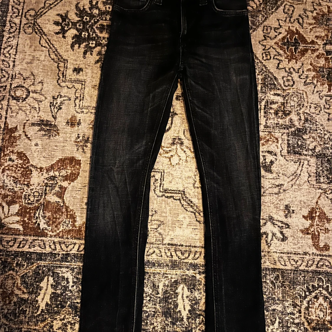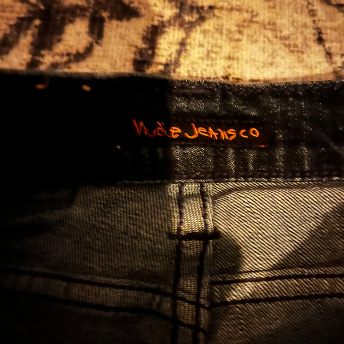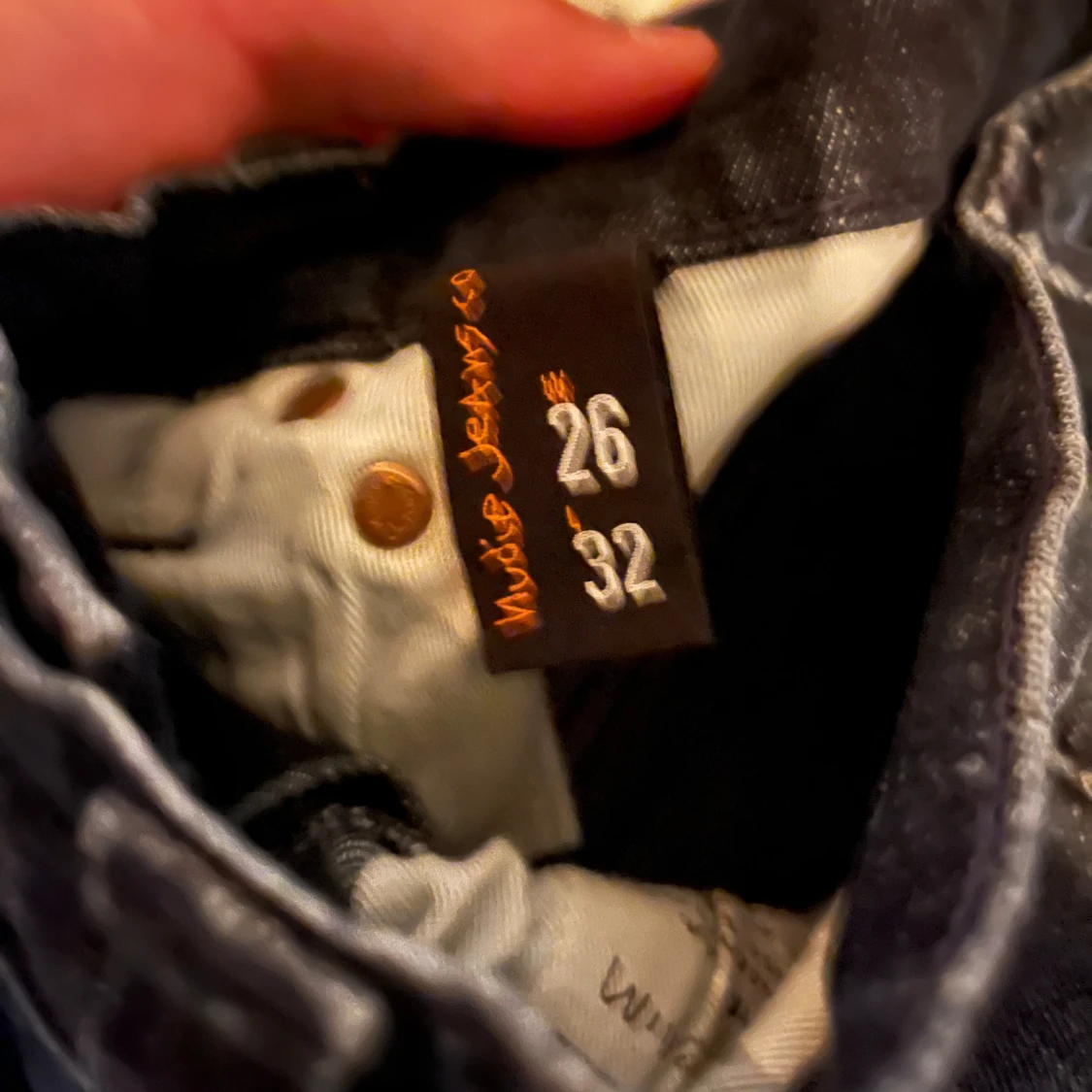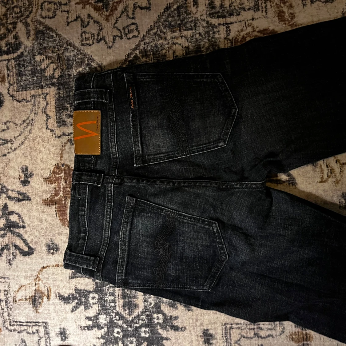 Snygga svarta jeans från Nudie Jeans Co i storlek 26/32. Jeansen har klassisk femficksdesign, orangea detaljer och en mörk tvätt med lätt slitning. Passformen är rak och materialet är mjukt denim. Perfekta för dig som gillar stilrena och tidlösa jeans.