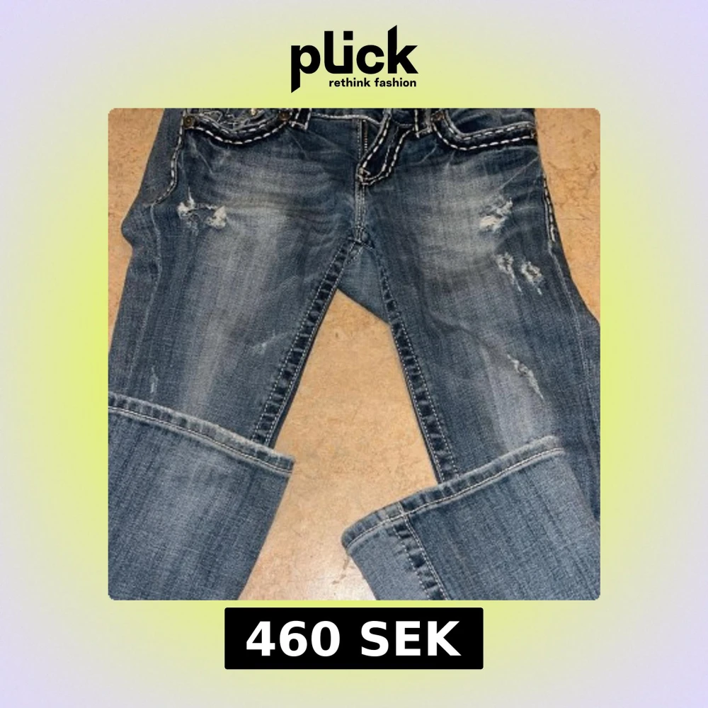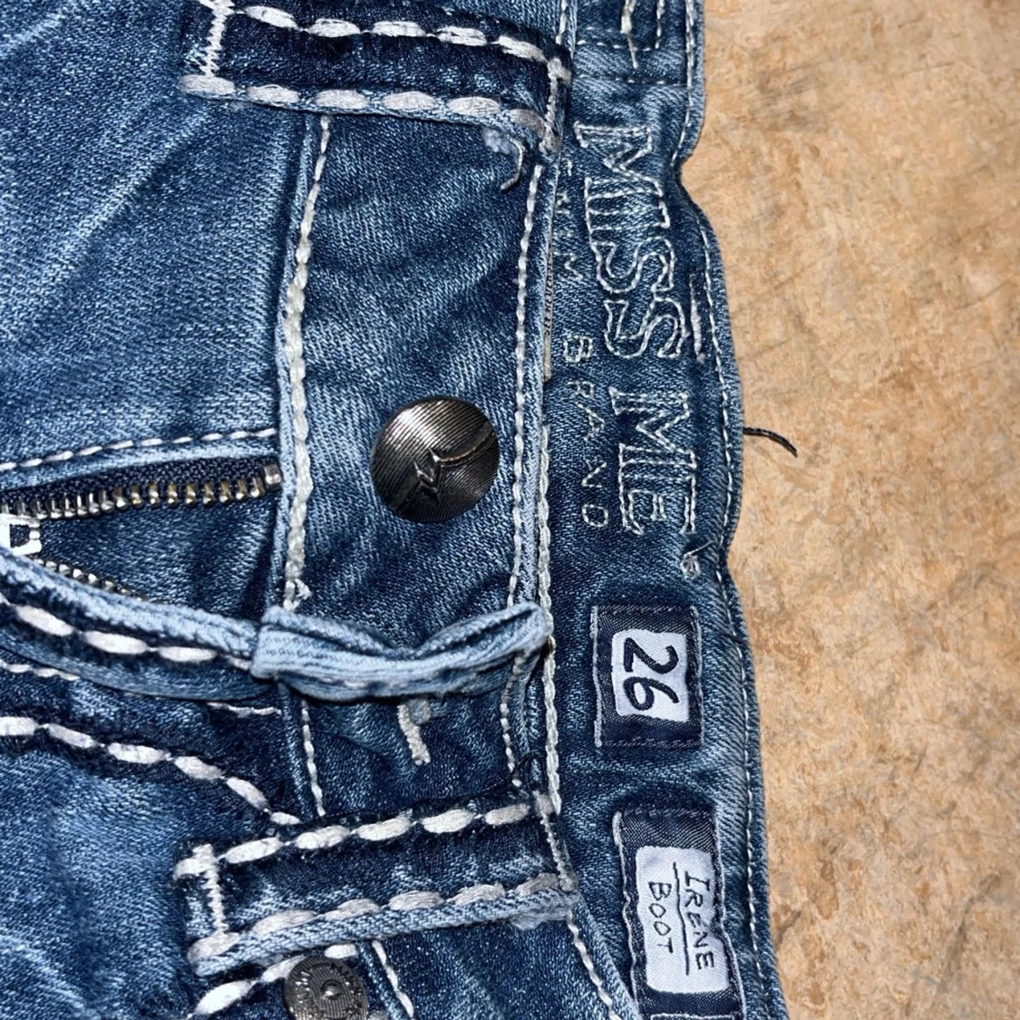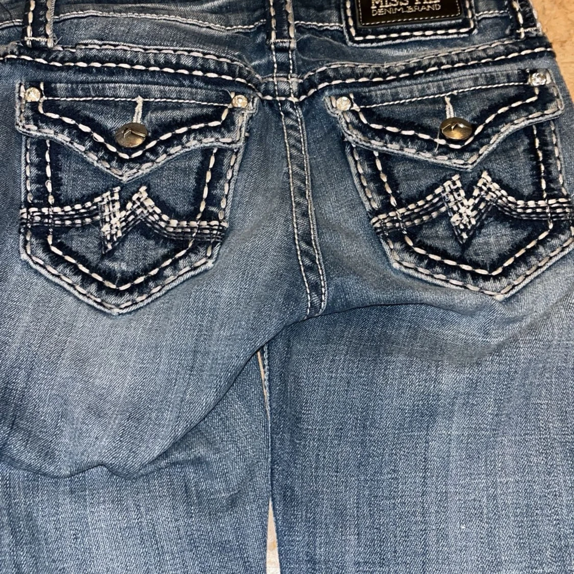 Snygga blå jeans från Miss Me med slitna detaljer och dekorativa sömmar. Byxorna har en bootcut-stil och är prydda med knappar och broderade bakfickor.
