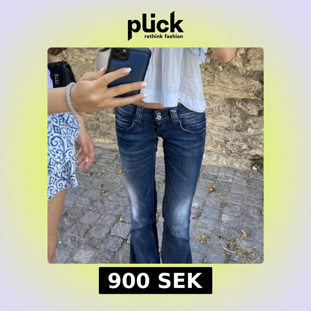 Snygga mörkblå jeans med bootcut och låg midja. Jeansen har slitningar och ljusare partier framtill, klassiska fickor och dubbla knappar i midjan. Perfekta för dig som gillar en retro vibe och vill ha ett par jeans som sticker ut. Har sytt om till bootcut själv. Midjemåttet 38cm rakt över och innerbenslängden 82cm💗