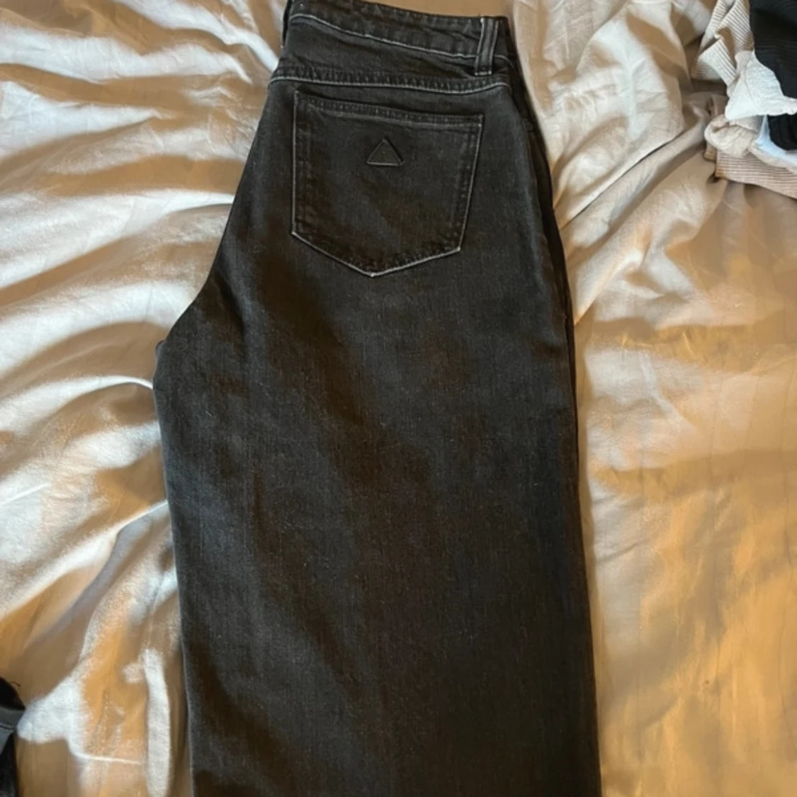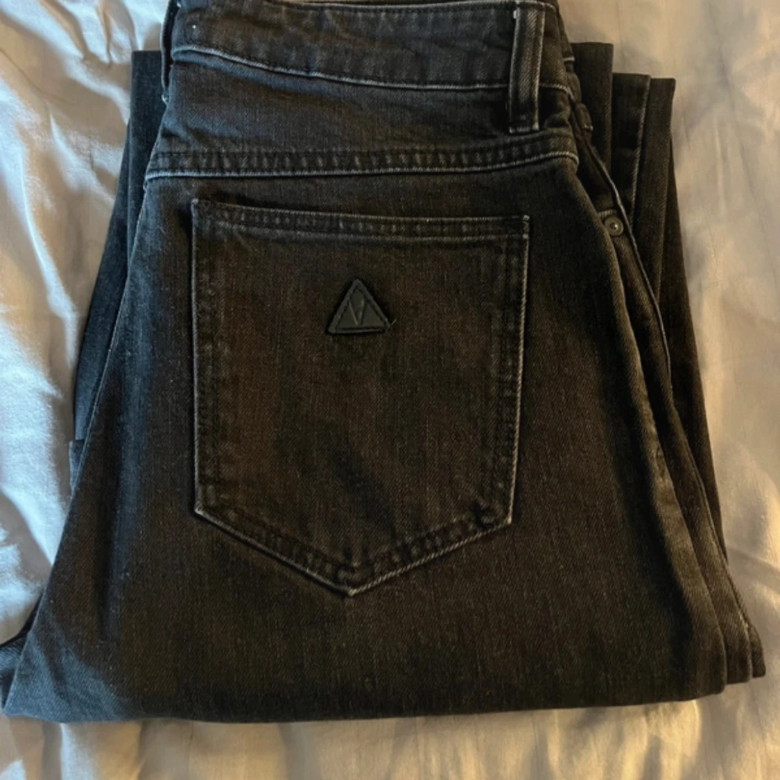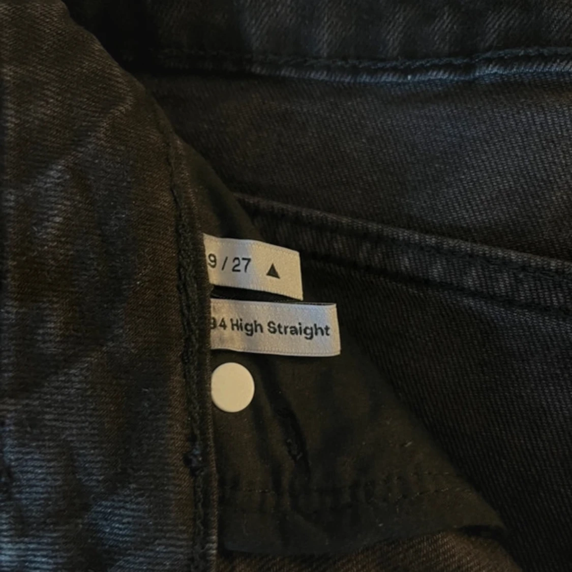 Säljer ett par svarta jeans från Gina Tricot, modell 984 High Straight. De har hög midja och raka ben, klassisk femficksdesign och diskret logga på bakfickan. Jeansen är i ett mjukt bomullsmaterial med lite stretch för extra komfort. Dom passar mig som är 157cm