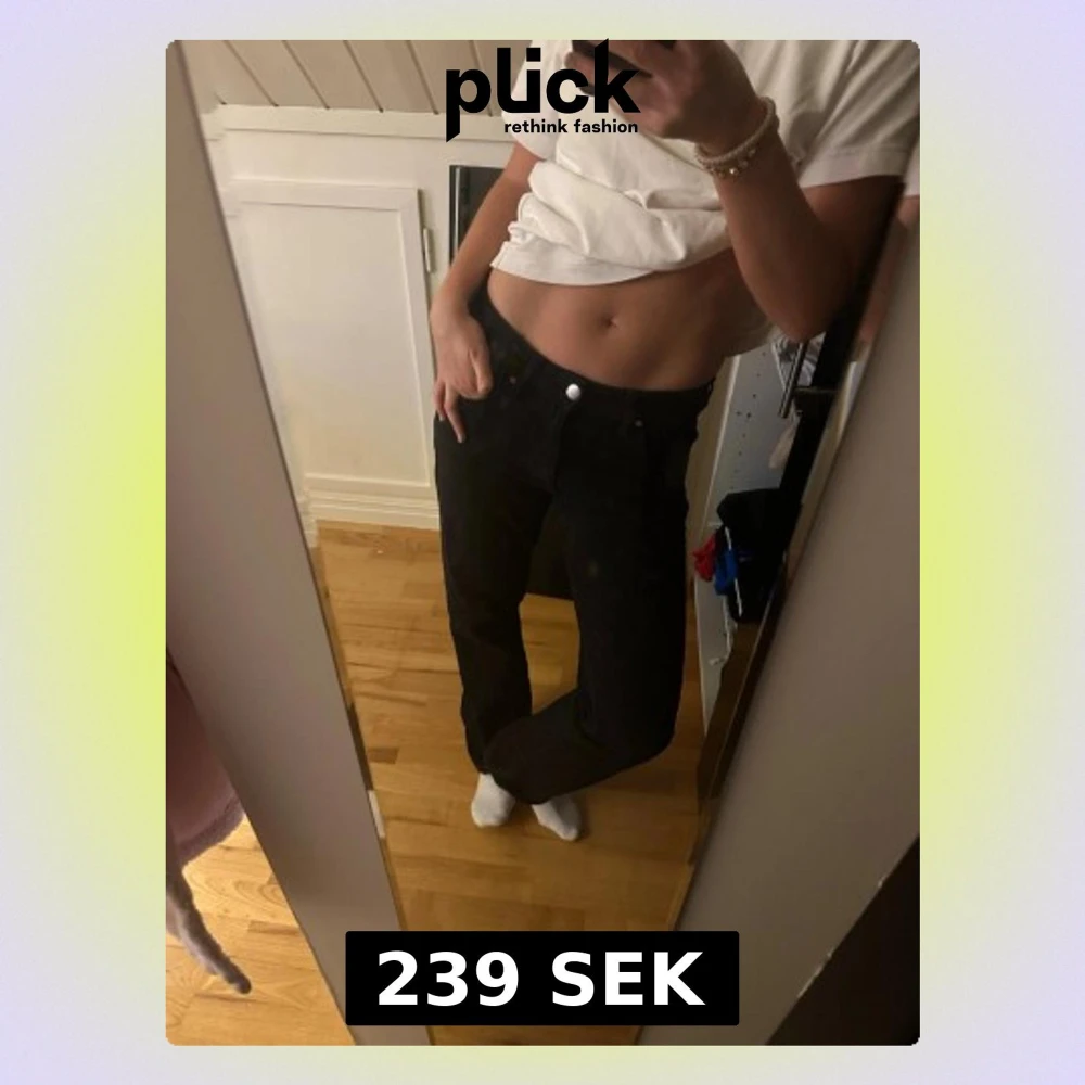 Säljer ett par svarta jeans från bikbok med låg midja och raka ben. Modellen är straight och de har klassisk femficksdesign med silverfärgade nitar och knapp. Materialet är jeans och passformen är normal. Perfekta om du gillar en chill och enkel stil. Nypris 599kr.