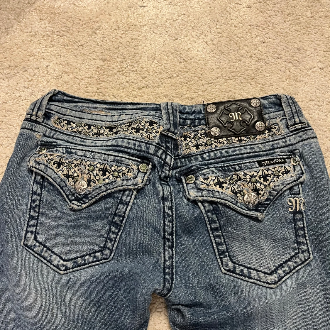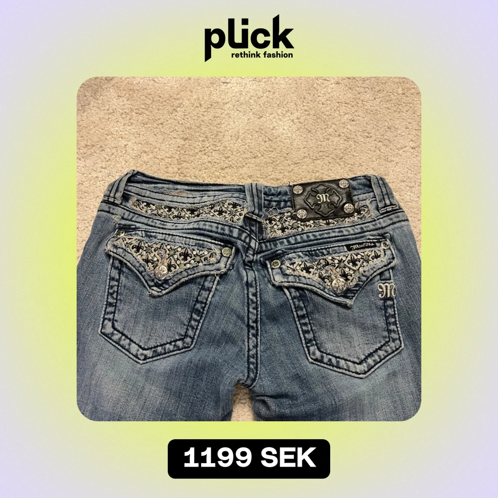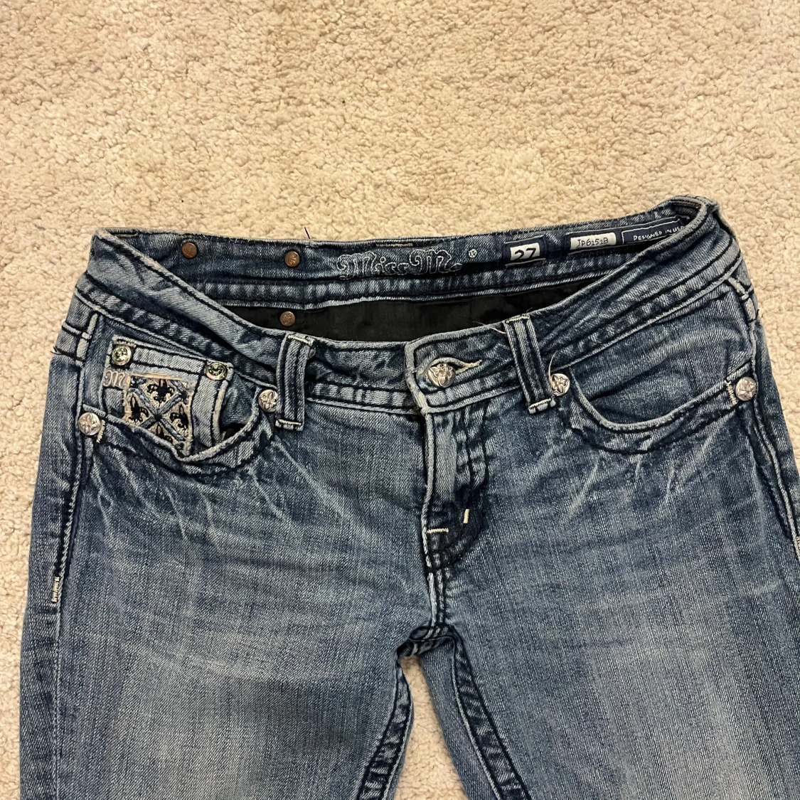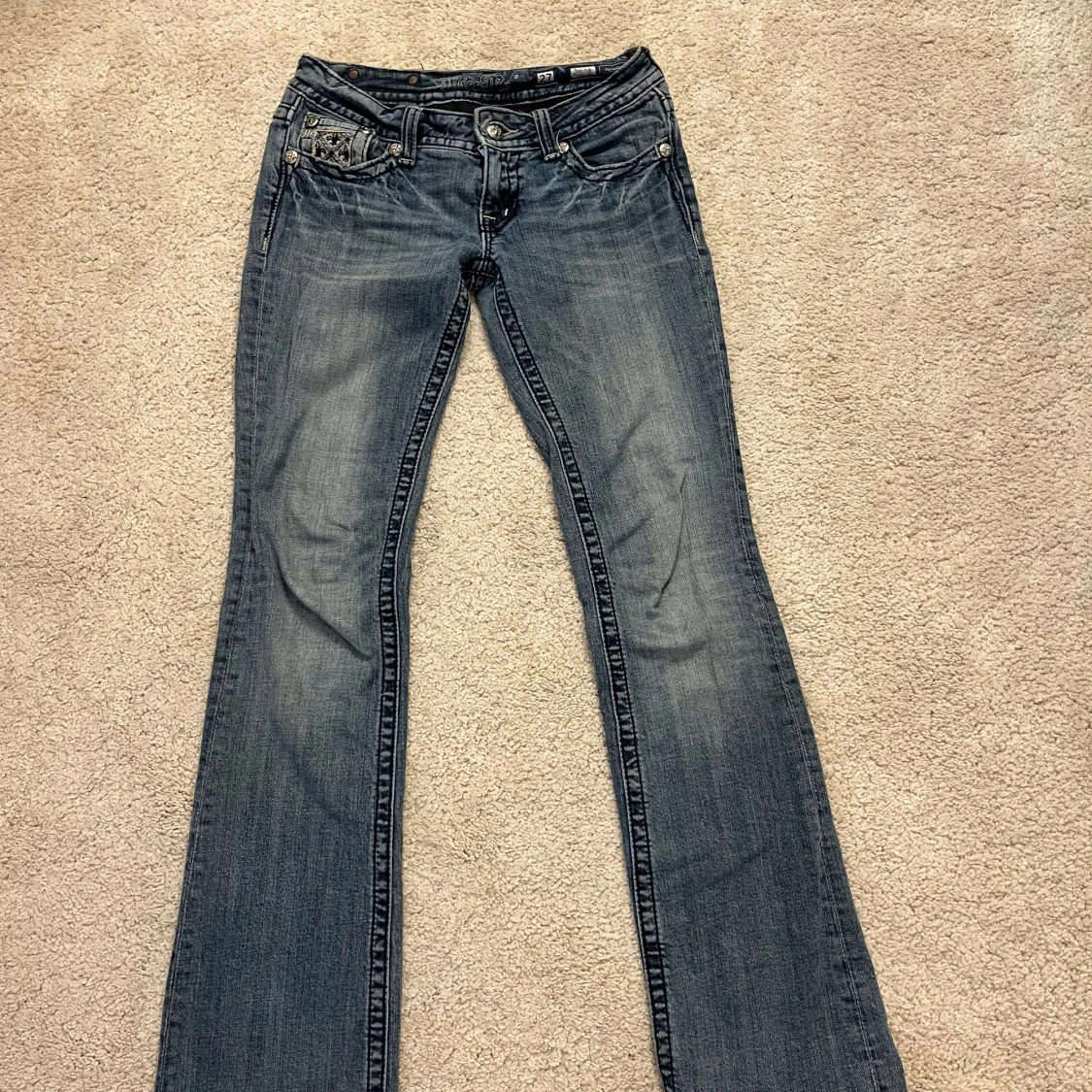 Snygga blå jeans från Miss Me i storlek 27. De har coola broderade detaljer på bakfickorna och en klassisk femficksdesign. Jeansen är bootcut. De är i bra skick💗