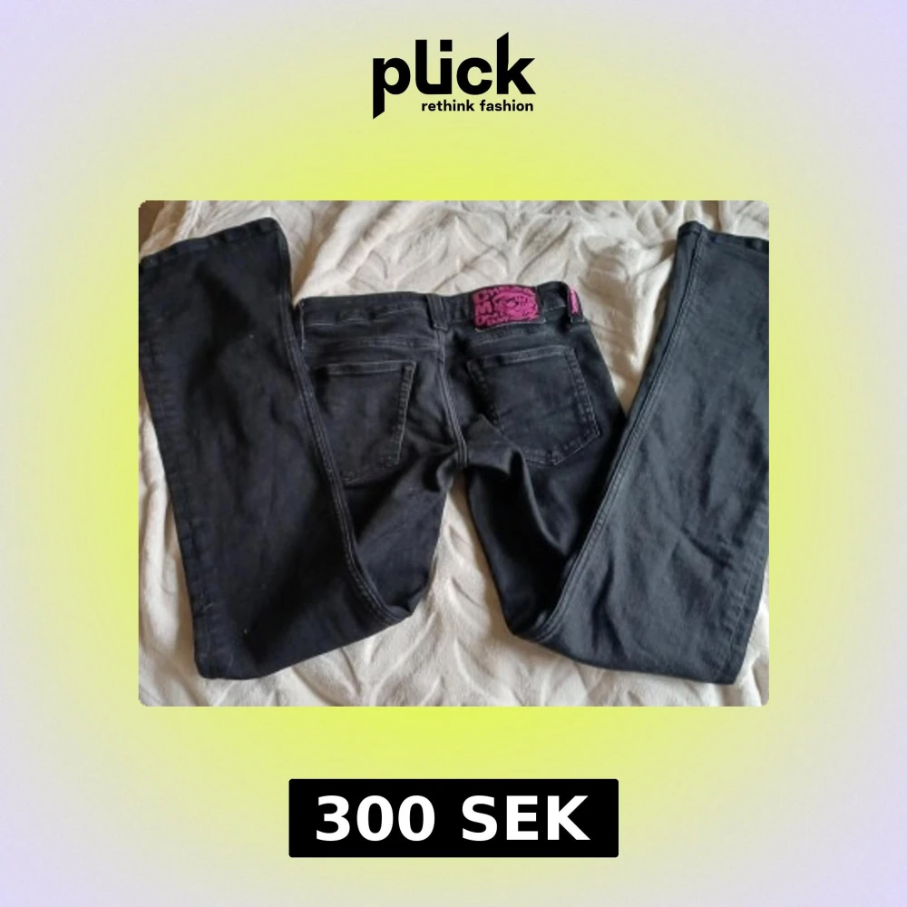 Svarta jeans från Cheap Monday med klassisk femficksdesign och en snygg rosa patch med logga bak i midjan. Storlek 28/30
