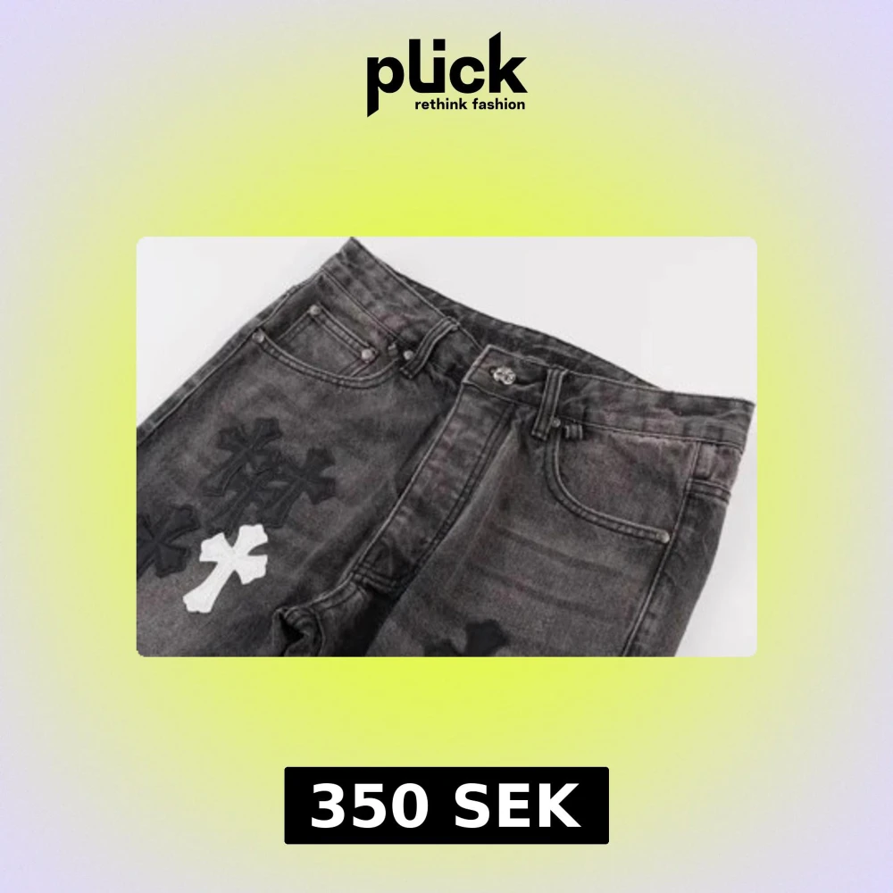 Unika svarta jeans med broderade kors i svart och vitt på framsidan. Jeansen har klassisk femficksdesign, silverfärgade knappar och en cool tvättad look. Materialet är robust denim och passformen är straight. Perfekt för dig som vill sticka ut med edgy detaljer.