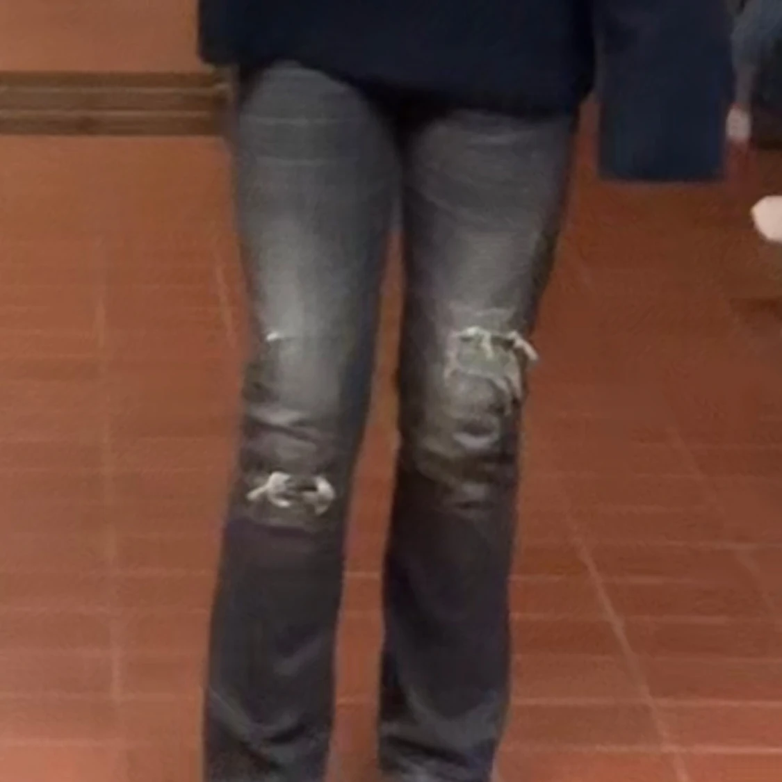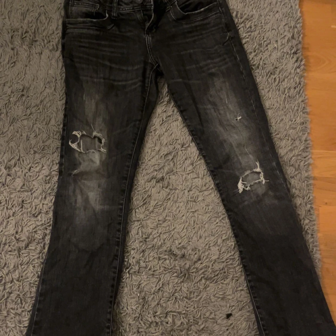 Snygga svarta jeans med slitningar på knäna. Andvänd fåtal gånger och i väldigt fint skick!