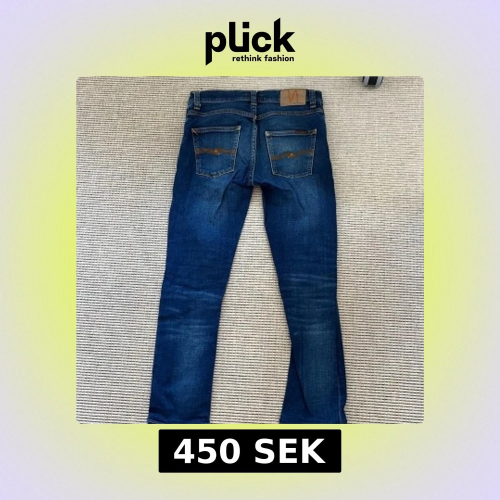 Snygga blå jeans från Nudie Jeans med klassisk femficksdesign och orange sömmar. De har en dragkedja och knapp framtill samt märkets logga på baksidan. Perfekta för en stilren och grich look.