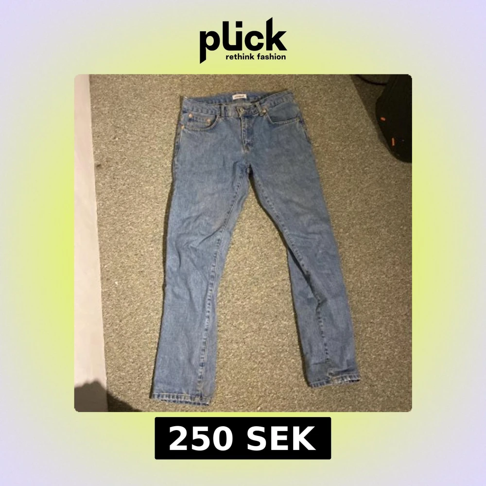 Säljer ett par klassiska blå jeans från Woodbird i modellen 90's Blue. De har en rak passform med fem fickor och knappgylf. Perfekta för en avslappnad stil.
