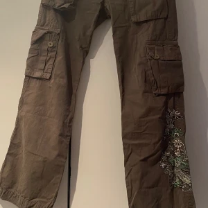 Lågmidjade cargopants stl 28 (midja). Färgen är brungrön. Broderi på höger ben