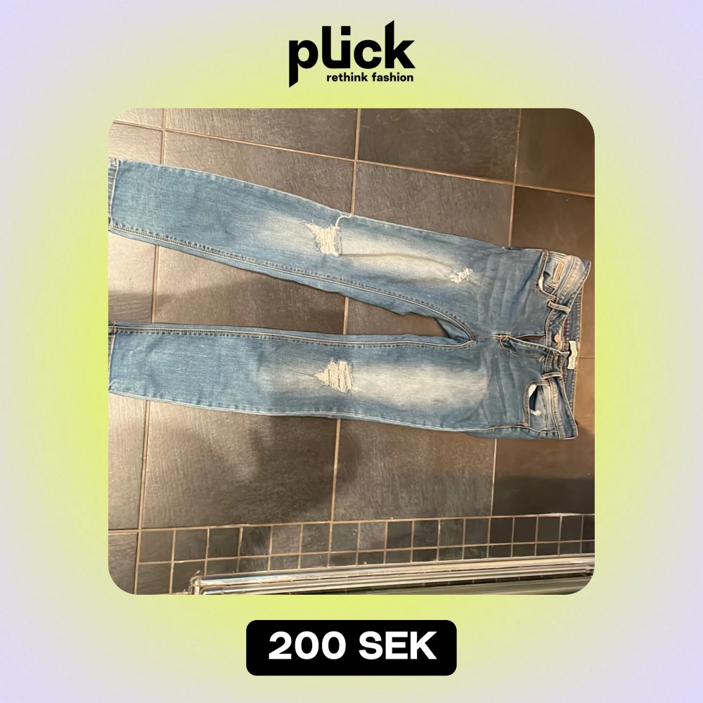Säljer ett par snygga blå jeans från Alcott i storlek 28. De har en cool slitning på framsidan och en klassisk femficksdesign. Perfekta för en avslappnad stil och passar till de flesta tillfällen. Sköna och stiliga