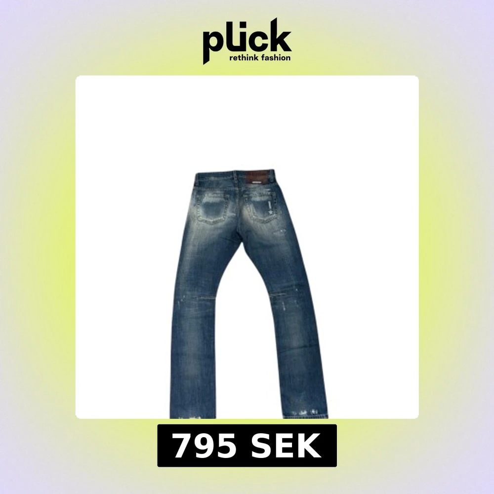 Säljer ett par blå jeans från Reign Italia med slitningar och hål på framsidan. Jeansen har raka ben, klassisk femficksdesign och läderpatch med logga bak. Snygga detaljer med stjärna på bakfickan och ljusa tvättade partier. Storleken är 28. 37cm i midja, 80cm innerben, 105cm yttreben